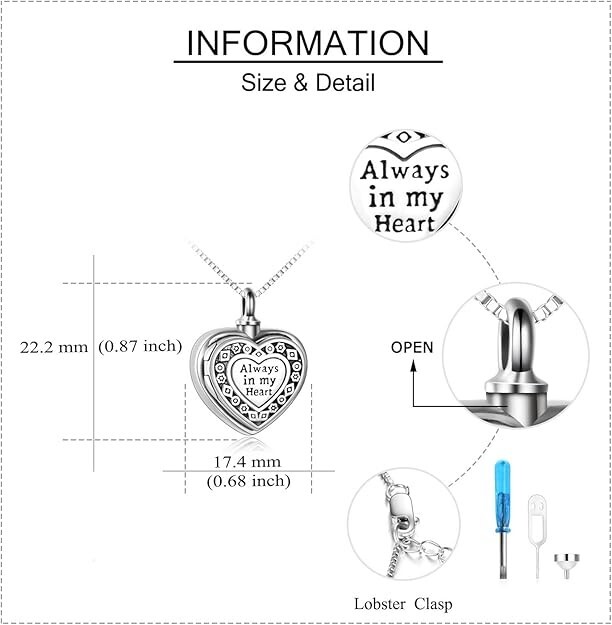 ONEFINITY Sterling Silver Locket for Ashes Always in My Heart Urn Necklace for Ashes Heart Locket That Holds Pictures for Women Ashes Necklace Keepsake Memorial Ash Jewelry MaterialSterling Silver Metal typeSterling Silver Chain typeCable About this item ❤DESIGN CONCEPT❤ keepsake urn locket pendant necklace engraved "Always in My Heart". Screws from the top of urn, you can put little ashes or hair in urn for memorial. And also you can choose 1-2 pictures on the locket to keep herhisits happy look as a cherish memory. Creative and Unique ashes keepsake necklace with picture for family, friends or yourself ❤Urn Necklace❤This urn necklace could be used for human ashes, dog cat ashes, amount of cremated remains, love proverbs, other soul souvenirs or any tiny object you want to keep close to your heart. ❤ MATERIAL❤: The Urn Necklace is Sterling Silver, Nickle Free, Hypoallergenic,never rust, corrode, rust or stain. Urn Pendant size: 22.2 mm*17.4 mm/0.87 Inch*0.68 Inch, Weight:8.2 g, Rolo Chain 18 Inches ❤Urn Jewelry Gift❤ Cremation Jewelry for ashes Dad Mom Husband Son Brother Daughter Sister Grandma Grandpa Aunt Wife, pet's ashes, hair or perfume, memorial cremation ashes keepsake or taste, Stay with you forever . We offer FREE shipping on all orders! . We ship within Five business days of payment, usually sooner. . We use a selection of shipping services such as UPS, FedEx, USPS etc. . We only ship to the lower 48 states, no APO/FPO addresses or PO Boxes allowed. . Local pickups and combined shipping options are not provided at this time. . Your satisfaction is a wonderful reward for our efforts. Please assist us by leaving a positive review if you feel pleased with our service. . In the event that you encounter any difficulties related to your order, please do not hesitate to reach out to us directly through the Messaging system on the Ebay platform. Kindly consider opening a COMPLAINT or a RETURN REQUEST as a last resort, only after all other possible measures have been attempted and we have been unable to provide you with assistance. . We will get in touch with you within 24 hours and make every effort to ensure your satisfaction. . Please rest assured of our service quality.