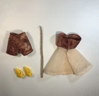 This OOAK clothing set is designed for Barbie dolls and features a vintage-inspired pinup vibe 2-piece skirted swimsuit and matching shoes. The set includes a complete outfit, with shoes & swimsuit, all made from quality cloth material. Perfect for collectors or Barbie enthusiasts, this unique set adds a stylish and fun touch to any Barbie doll collection. Please note that the doll is not included with this set.
