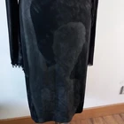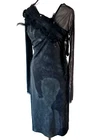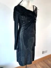 Good used condition with no faults found. Unusual quirky black figure hugging dress with unique embellishments - see the pics! Will look utterly glamorous with a goth edge. Measures 18" pit to pit, 15" across waist area approx, 19" across hip area approx, appears to have a person on the front! Length nape to hem 38". Feathers, wool, beads, all sorts going on here. Sleeve 27". 100% polyester, made in Italy.