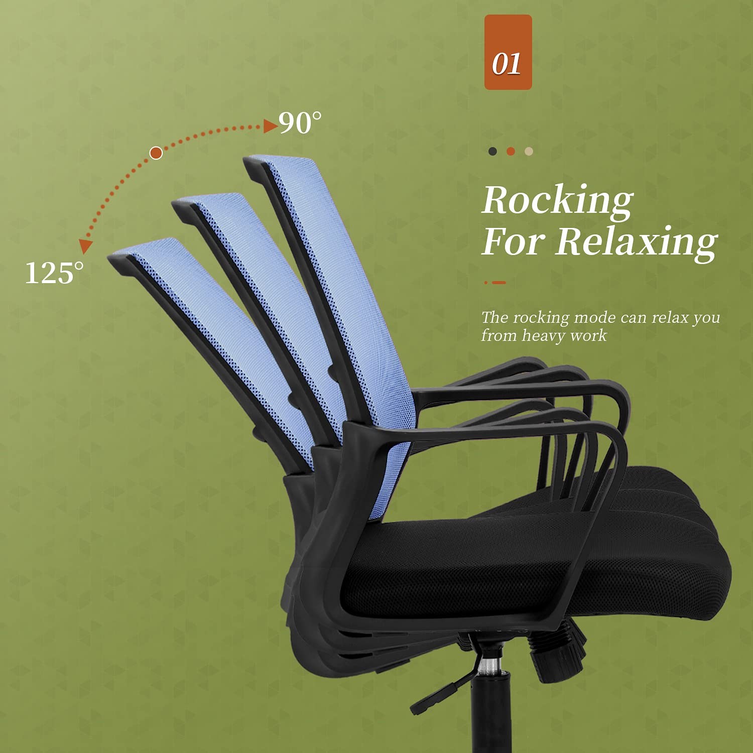 šćErgonomics Designć Our office chair with ergonomic design gives you maximum support for comfort and convenience. The desk chair has back support for less pressure on the back of your legs so you can stay comfortable even when you have to sit down for hours. Ample foam padded contoured seat with waterfall rounded edge contributes to good blood flow by reducing the pressure at the back of the legs and keeps your back and thighs posture perfect. šćSturdy & Durableć Our mesh office chair has a heavy-duty Nylon base that great stability and mobility.Skin-Friendly and No Smell at all, breathable mesh back keeps you cool throughout all day. We adopts high quality accessories strictly meet BIFMA Standard to max ensure your safety. Our computer desk chair is ideal for home and office use. šćAdjustable & Rocking Functionć With the adjustment lever, itās easier to adjust the height lower or higher. Pull out the lever to start the rocking mode, and pull the lever in to stop, which allows you to have a break during a long time working. This chair can support up to 250 lbs. šćVersatile Useć Commercial grade material and quality creates a superior chair that can be used in home offices, commercial business work spaces, college dorm rooms and student study spaces in the home. šćEasy to Assembleć We provide all the tools and the detailed instructions for you. No additional tools needed for assembly.It is easy to assemble this office chair by yourself at home.