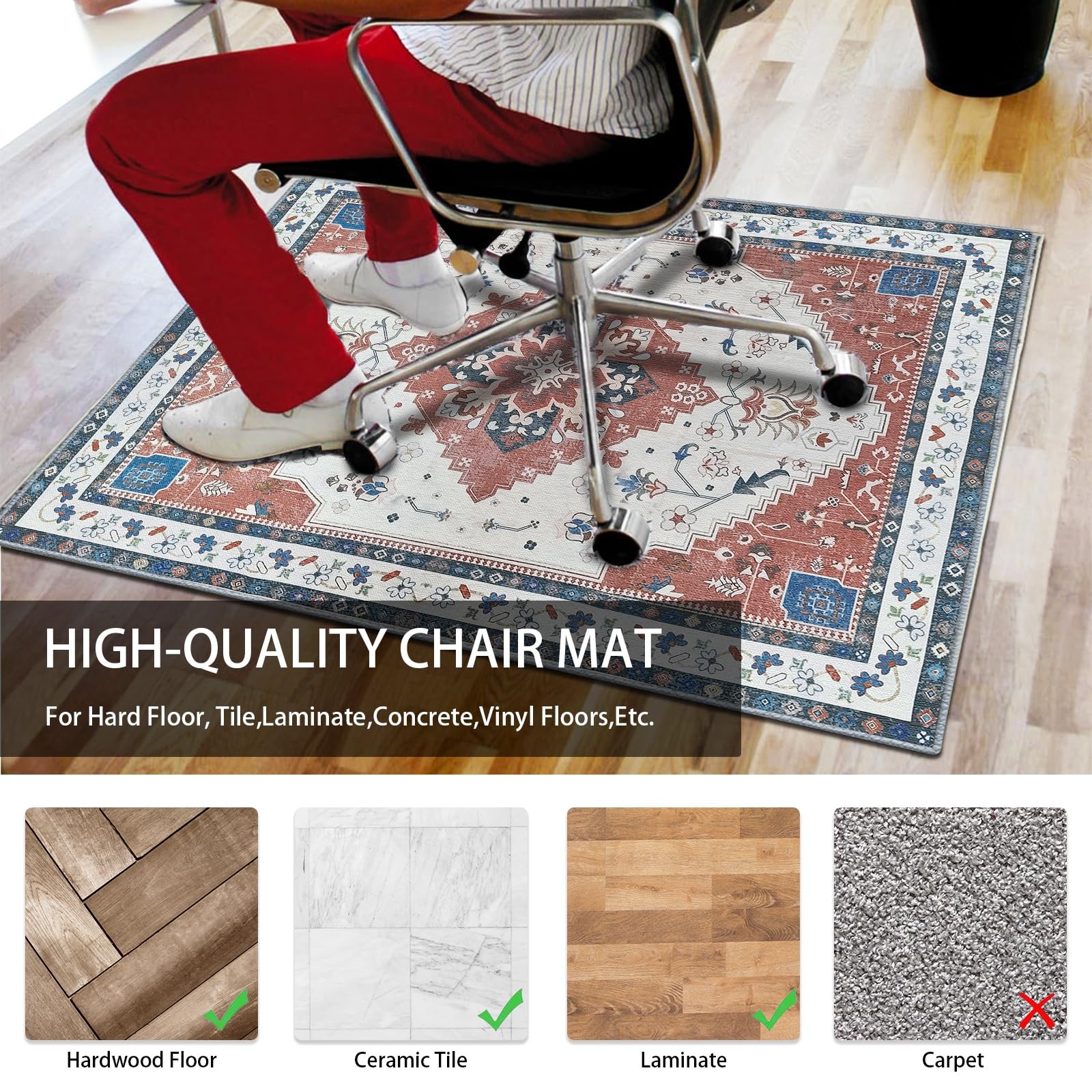 1 ⭐HIGH QUALITY CHAIR MAT - The chair mat size is 36x48 inches. Made of 100% high density polyester fibers and non-slip liner. Keep your healthy indoor environment. No folding, non-curling, non-fading, odourless, pet friendly, non-toxic. This chair mat is designed for HARD FLOOR only, not for carpet. NOTE: Please tear off the PE film on the back before use. ⭐NON-SLIP & EASY TO MOVE - The back of the chair mat is made of upgraded absorbent material, Super non-slip. Before using it, be sure to tear off the film on the back, stick it firmly on the hard floor, it will not cause any damage to your wooden floor. It doesn't have any residue. ⭐EXCLUSIVE DESIGN CONCEPT - The pattern of our chair mat is desinged in distinctive, Can be choosed in variety of patterns. Suitable for your game room, bedroom, living room and office room, ideal gift for friends and family. No matter what style of your home is, it can fit perfectly. ⭐EASY TO CLEAN - If the surface of the chair mat is dirty, you can use the vacuum cleaner directly. When not in use, it can be easily folded and stored. note: It is folded in the package for delivery. There may be slight creases when first used. Ironing at low temperature will make the mat to remove creases faster, or press it for a while with a heavy object and it will recover flat completely. ⭐CUSTOMER SATISFACTION - Providing a 100% satisfaction experience is our main priority to our customers. Feel free to message us if our carpet stair treads don't meet your expectations or have any questions. We will reply within 24 hours and guarantee to provide you with a satisfactory solution.