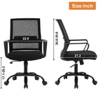 Office Chair Mid-Back Computer Chair Mesh Student Desk Chair with Lumbar Support Executive Task Swivel Chair with Wheels Adjustable Rolling Chair, 250lbs(Black) Product Details Color: Black Product Dimensions: 22.8"D x 21.2"W x 36.8"H Back Style: Solid Back Special Feature: Adjustable Unit Count: 1.0 Count Unit Count: 1.0 Count Item Dimensions D x W x H: 22.8"D x 21.2"W x 36.8"H Pattern: Solid Color: Black Back Style: Solid Back Material Type: Metal Maximum Weight Recommendation: 250 Pounds UPC: 840137927999 Manufacturer: Better Choicet Age Range Description: Adult Included Components: Caster Surface Recommendation: Hard Floor Recommended Uses For Product: Office Room Type: Office, Study Room Furniture Base Movement: Swivel Special Features: Adjustable Ergonomic Backrest Design: Our mid-back office chair uses an ergonomic backrest, which provides you with good lumbar support. The backrest is made of comfortable and breathable mesh fabric, which allows you to stay away from the sweltering heat, and work more enjoyably Comfortable Breathable Seat: The seat of our home office chair is made of high-quality thick sponge and breathable mesh fabric, which makes the hips and legs comfortable and cool PU Silence Wheel&Heavy-duty Metal Base: The high-quality PU silence caster has good mobility, you can easily move the computer desk chair quietly, and will not damage your wooden floor and carpet. The heavy metal base has good stability and can ensure the safety of users. All accessories have passed the BIFMA test to ensure your safety during use Adjustable Computer Chair: The adjustable backrest can be recline, make you to rest more comfortably. you can adjustable the height of the office desk chair make suitable for you.Item Dimensions:21.2(L) x 22.8(W) x 36.8-39.8(H) inches. The weight limit on this chair is 250 pounds Assembly & Multiple Functions: All hardware are included in the package. Follow the instructions, you will find it easy to install, and the estimated assembly time is about 10-15 minutes, then the office chair can be used. It is a good choice to put this home office chair in your office, family or activity room Office chair a good helper for your busy work: The front edge of the seat is waterfall-like, which make your thighs and buttocks comfortable. Well made wheels move well, you can move the chair quietly and easily. The appearance of the computer chair is stylish and beautiful, elegant and generous, and can meet your needs in any occasion. It is a good helper when you work. FEATURES: Ergonomically Designed Office Chair Breathable Mesh Backrest The Soft Seat Made of High-quality Mesh Fabric and Thick Sponge Heavy-duty Metal Base Well Made 360 Degree Swivel Wheel 3 Adjustable Position A softer seat: There's a circle under the chair, if you turn it, it will lessen the force required to the lean back in the chair. Height of the seat: you can adjustable the height of the office desk chair with the handle wheel on the explosion-proof tray, provides you comfortable and safety. Backrest: This chair will not lay flat but can recline,in order to recline, please pull the handle on the side out. Tip: The height is suitable when the user sits on the chair with his back straight, his arms and lower arms, and the angle between his thighs and lower legs is 90 degrees. Item Detail: Total size: 21.2(L) x 22.8(W) x 36.8-39.8(H) inches Height of the seat: about 17.1-20.2 inches Size of the seat: 22.8(W) x 21.2(D) inches Colour: Black Why choose us: Better Choicet will bring you the best experience, our chairs use the finest craftsmanship and the best materials. Stylish and durable, our chair will be a good helper when you study and work. If you have any questions during use, please feel free to contact us.