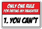 Get a fun novelty sign for your home and office and show off your sense of humor. Looking for a fun , hilarious novelty sign to hang on your cubicle or in your “man cave”? If so, has all the cute, funny, hilarious, and even work-related novelty signs you’re looking for! Something for Everyone We’ve got a wide range of American-made signs just like this Only Rule For Dating My Daughter You Can't Novelty sign that will tickle your funny bone, make others smile, or even show off your snarky attitude. Colorful and Durable novelty signs are crafted with outdoor-durable aluminum and premium inks that perfectly highlight the colors and image on the front. And because they’re safe for indoor and outdoor use, you can stick on your patio, in the living room, or anywhere else you want to get people smiling and laughing along. Product Details: Only Rule For Dating My Daughter You Can't Novelty Sign Laser Cut Mounting Holes Indoor and Outdoor Use Rust and Fade Resistant -Sided Dimension: 12” x 18” Made in the USA Outdoor Durable aluminum and Premium-Inks Click 'Add to Cart’ to get your Only Rule For Dating My Daughter You Can't sign today and enjoy a good laugh each time you pass by! Sign Size: 12" X 18" Aluminum Perfect Gift – Good for decorating a work space or hanging in a den, this novelty sign makes a great gift for anyone Quick & Easy Mount – Comes with pre-cut mounting holes for hanging Indoor/Outdoor Use – Printed with ultra durable inks for a scratch resistant finish that will last for years Proudly Made In The USA – Buy with confidence from an American owned and operated company! Items are produced in our state-of-the-art facility in West Palm Beach, Florida