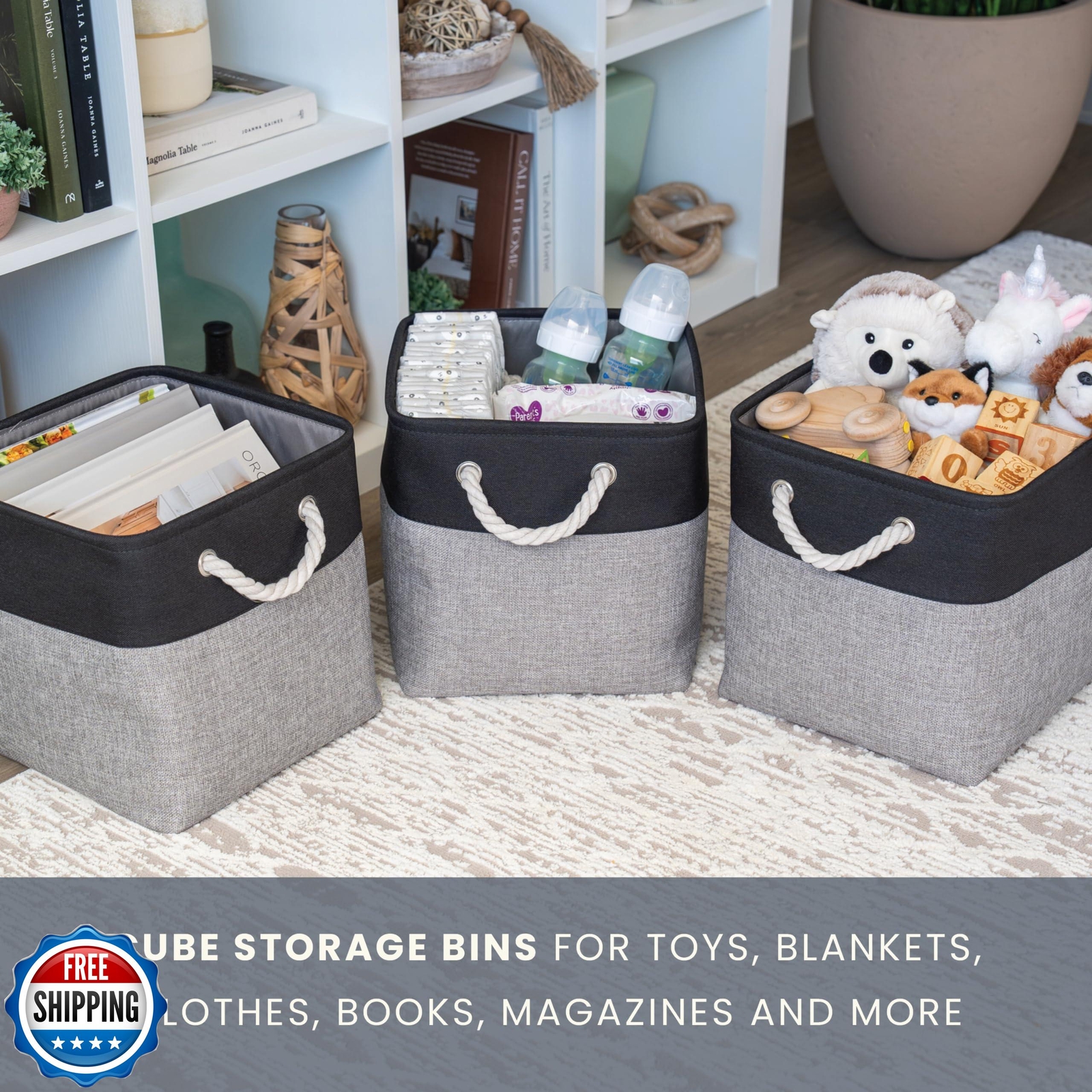 These bins are total game-changers! Super sturdy, easy to fold and store, and the rope handles make them a breeze to carry. Perfect for taming toy chaos and organizing closets. Love the modern gray/black combo too!