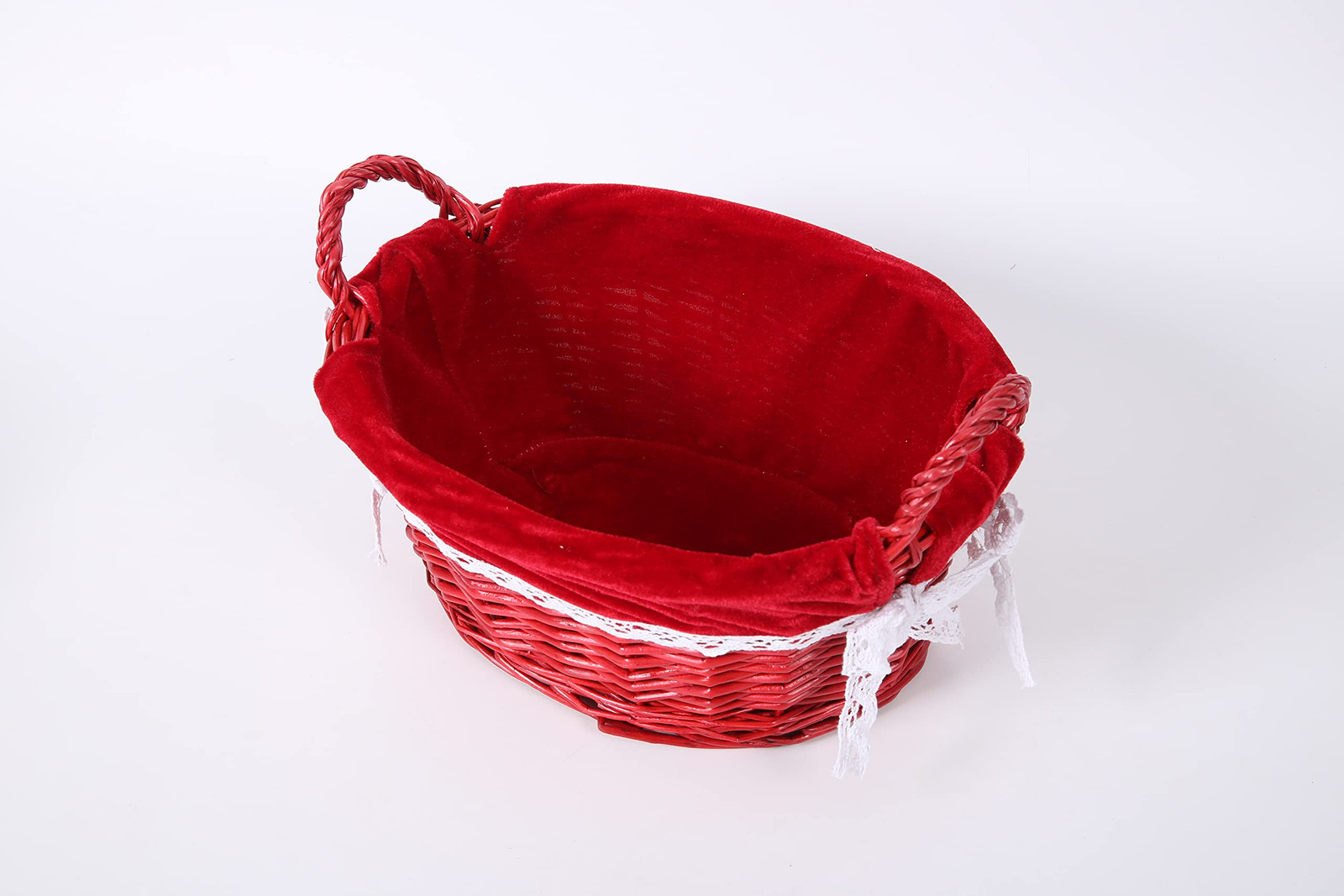 Red oval wicker storage basket with liner festival basket is made by professional craftsman.The basket is lined with a red soft cloth,and it is convenient for dismantling and cleaning.The basket is all-purpose. It is fitting in your classroom or living room that you can put on the closet, shelves Natural and eco-friendly.The Basket is made from quality wicker for durable usage and storage strength by professional craftsman. The basket is lined with a red soft cloth,and it is convenient for dismantling and cleaning. The basket is all-purpose. It is fitting in your classroom or living room that you can put on the closet, shelves Large size is 11.02"Lx9.06"Wx5.51"H,The height including handle is 7.48 inch,The small size is 9.06"Lx7.09"Wx4.72"H.The height including handle is 6.69 inch,Please note that these products are handmade and the sizes may vary ±1 inch. SERVICES COMMITMENTS: With our famous 100% satisfaction, you can have peace of mind. If for any reason you're not completely happy with your purchase- if it breaks, damaged in shipping, or even if you change your mind - simply let us know and we will either replace it or refund you, your choice!