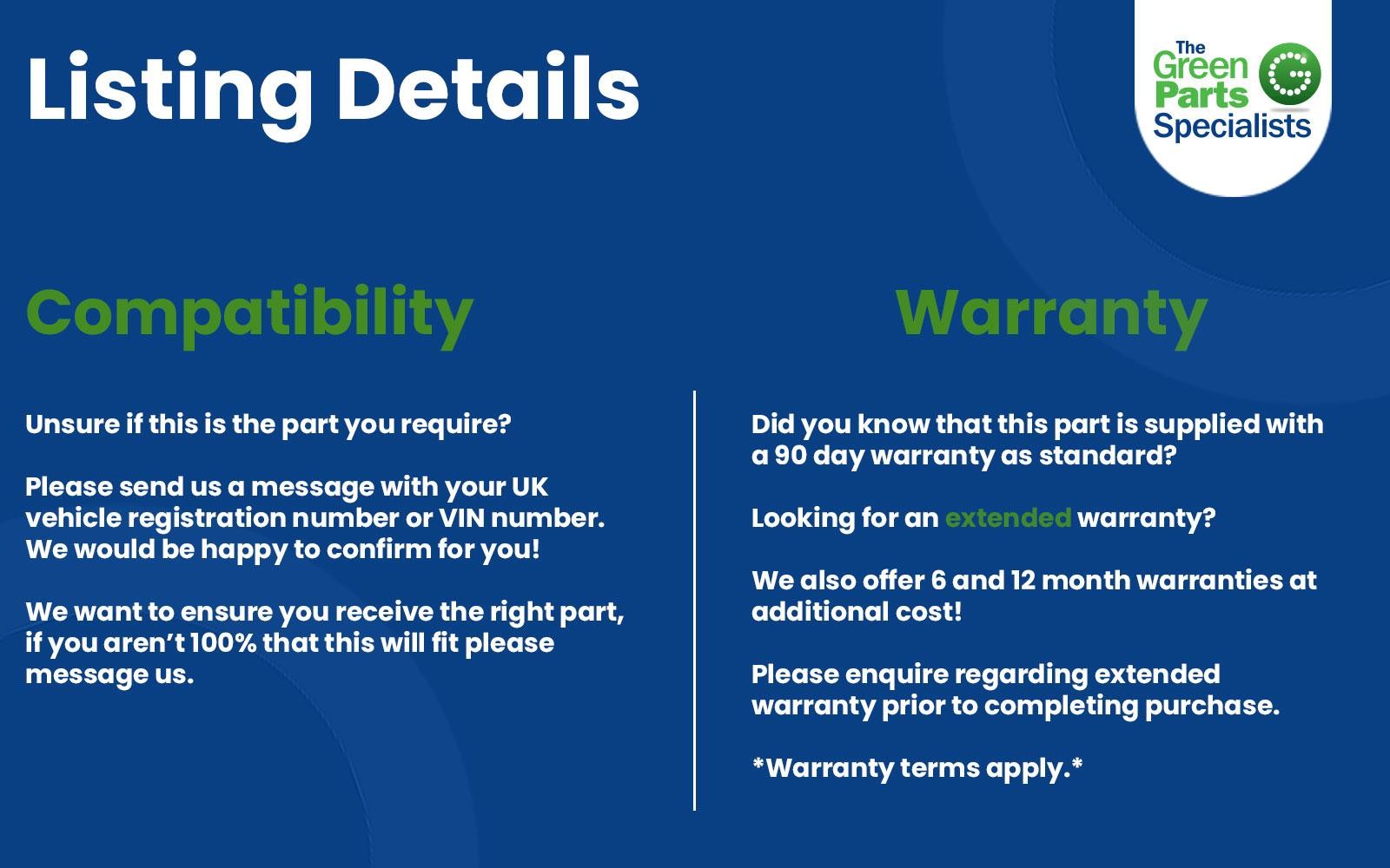 Vehicle Recycling Experts The right part, first time, and on time, every time. Parts from Vehicle Contact Us Vehicle Information Removed from a 2016 PEUGEOT 208 Part Information: Please quote reference: 0003656215 when contacting us. Warranty 90-day warranty included. Extended warranties available. Proof of fitting required for claims. Delivery International delivery available – Contact us for a quote. Year Manufacturer Model 2016 PEUGEOT 208 Doors Style Colour 5 Door Hatchback Black Engine Size Fuel Type Transmission 1199 Petrol 5 [mvr:speed] Manual Opening Hours We are open Monday - Friday 08:45 - 17:15. Please allow additional time when awaiting a response to messages. We are continually replying to high volumes of messages. For bank holidays and holidays opening hours please message prior to making a journey to avoid disappointment. Delivery Green Parts Salvage & Recycling Ltd (“GPSR”) is part of the UK Internal Market Scheme (“UKIMS”) which authorises GPSR to move goods as ‘not at risk’ from the UK into Northern Ireland for sale or final use. As such, goods purchased from GPSR are sold on the basis that the end customer is located in Northern Ireland, and are not at risk of entering the EU. If this is not the case, please let us know. International delivery is listed above in the postal section if your country is not listed please contact us for a quote. (Please note ALL International sales to offshore addresses will be liable for extra freight charges) If you are experiencing any issues regarding delivery please contact us using the eBay messaging system. Warranty All of our engines are supplied with a 3 month fault free warranty. We are unable to cover any labour costs. All parts are stamped and removal of the marks will invalidate your warranty. We offer 30 day return on all of our items. If you need anymore information please use the eBay messaging system to ask us a question. Returns We offer a 30 day return on all of our items. If you require to return this item for any reason please follow the steps below: 1. Please find this item in your purchase history. 2. Click more actions - return this item. 3. Select your reason for return. 4. Add your details. 5. Click the request a return button. Please inspect all good before signing to ensure the item has not been damaged in transit. If the couriers refuses simply write DAMAGED and then sign. This is to ensure that if necessary, a claim can be made against the courier company. If goods prove to be damage do not sign and contact us immediately. In the event that a part is supplied and proven to be incorrect or faulty, we must be notified within 48 hours. If a replacement is not available then a full refund will be offered but we cannot cover labour. In the event that a part is supplied correctly but the customer had made an error. We must be contact immediately and the part returned to us within 30 days at the cost of the customer. Delivery will not be refunded and a 20% free will the be charged. If you have any further questions regarding returns please contact us using the eBay messaging system.
