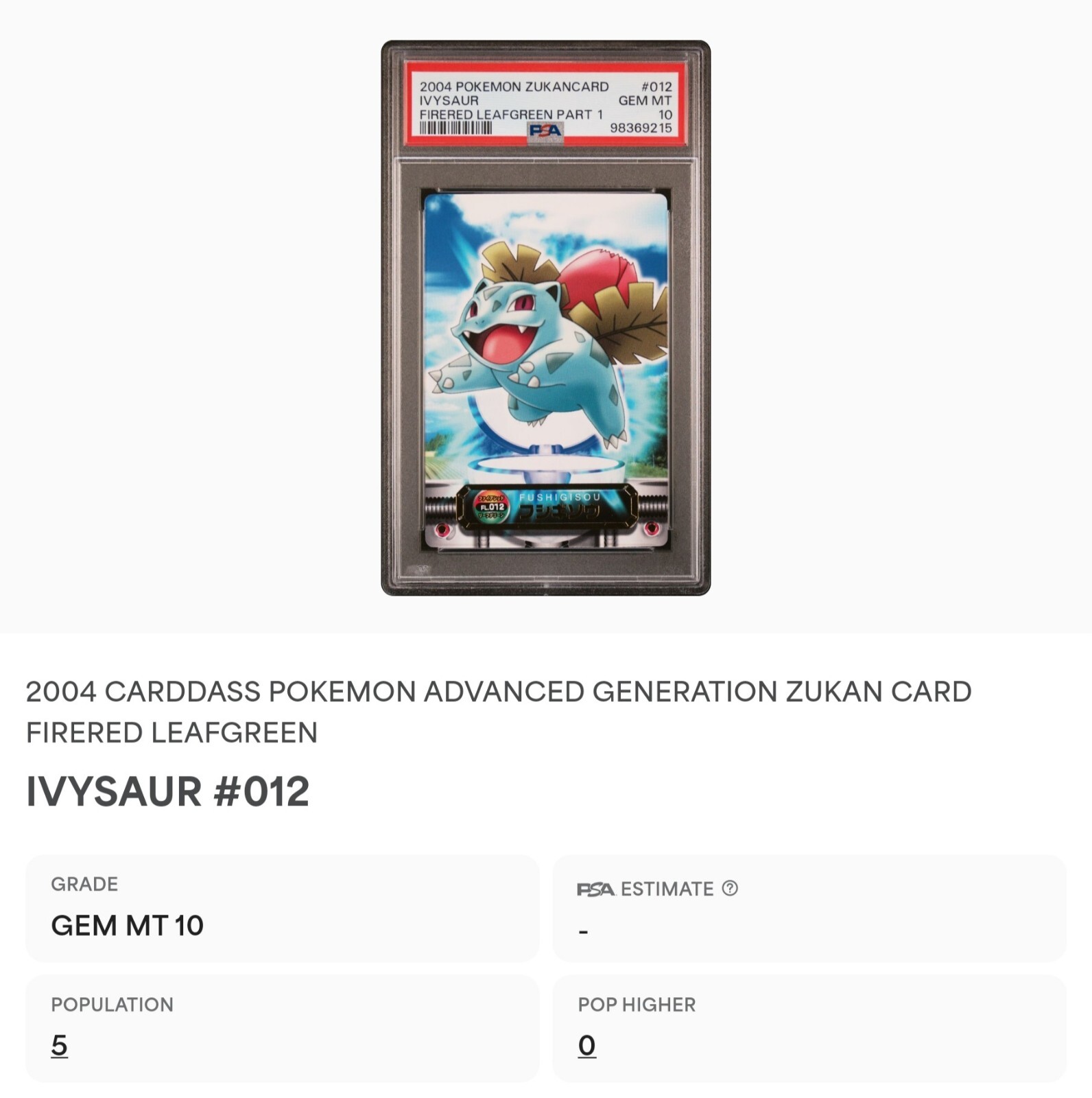 PSA 10 GEM MINT Ivysaur #012 Carddass Zukan F-Red L-Green Bandai Pokémon POP 5. POP 5 as of 11/27/24. Please reach out with any questions and we would be happy to assist you. Returns are not accepted. You will receive the exact graded card pictured. Please see high resolution scans. Purchase of this item signifies agreement that Grade, Actual Condition and expected standards all match. Please see PSA website for more info. Shipping info: All graded cards are shipped securely in bubble mailer and cardboard box; regardless of price. Please reach out with any concerns before contacting ebay and we'd be happy to assist you. Please note that due to inventory accuracy, purchases will not be cancelled before or after shipping. Please reach out with any questions before purchase and we would be happy to assist you.