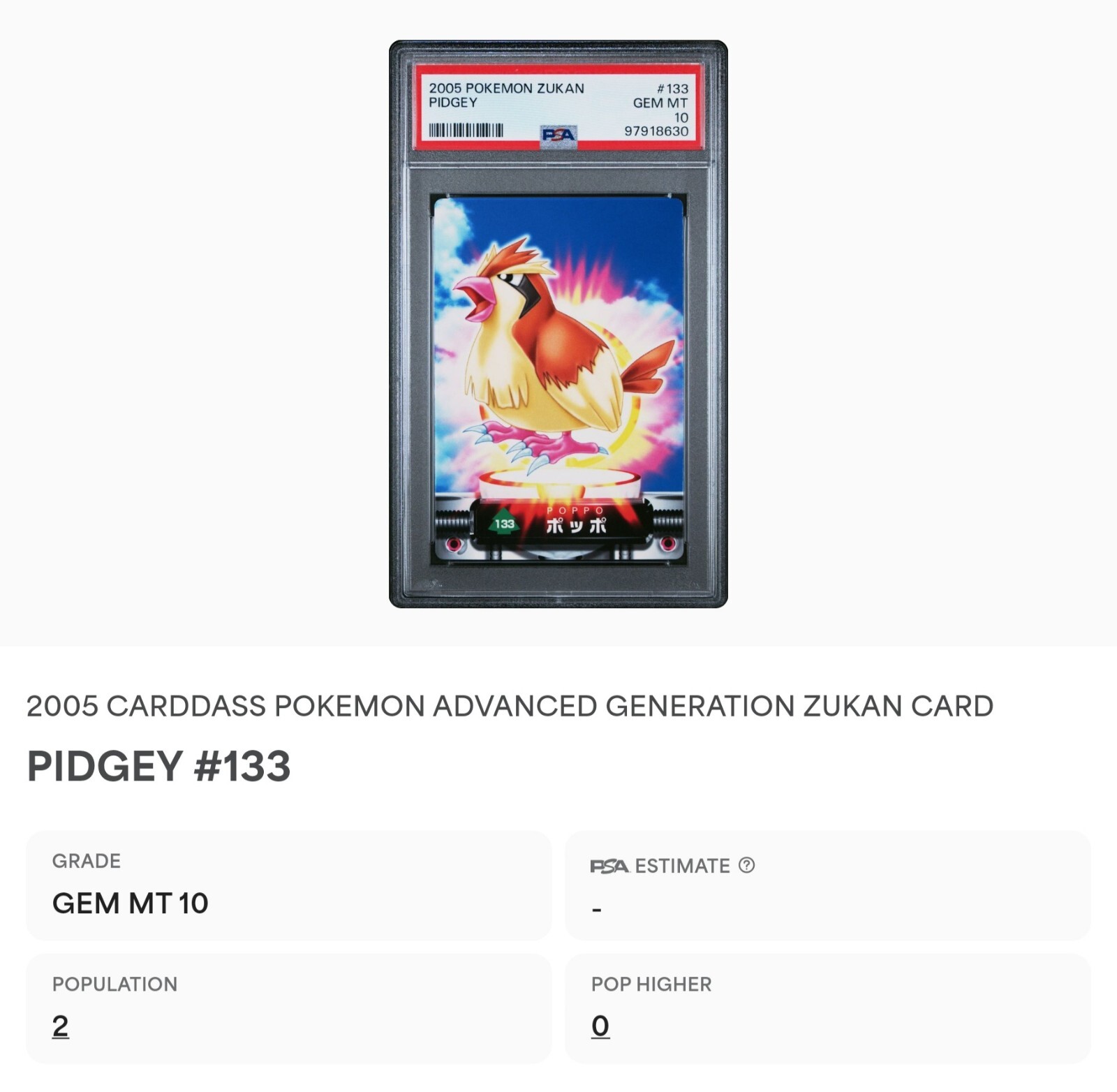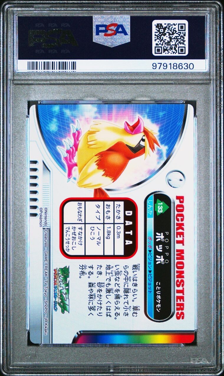 PSA 10 GEM MINT Pidgey #133 Carddass Zukan Advanced Gen. Bandai Pokémon POP 2. POP 2 as of 11/29/24. Please reach out with any questions and we would be happy to assist you. Returns are not accepted. You will receive the exact graded card pictured. Please see high resolution scans. Purchase of this item signifies agreement that Grade, Actual Condition and expected standards all match. Please see PSA website for more info. Shipping info: All graded cards are shipped securely in bubble mailer and cardboard box; regardless of price. Please reach out with any concerns before contacting ebay and we'd be happy to assist you. Please note that due to inventory accuracy, purchases will not be cancelled before or after shipping. Please reach out with any questions before purchase and we would be happy to assist you.