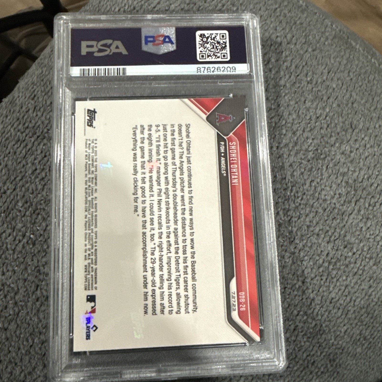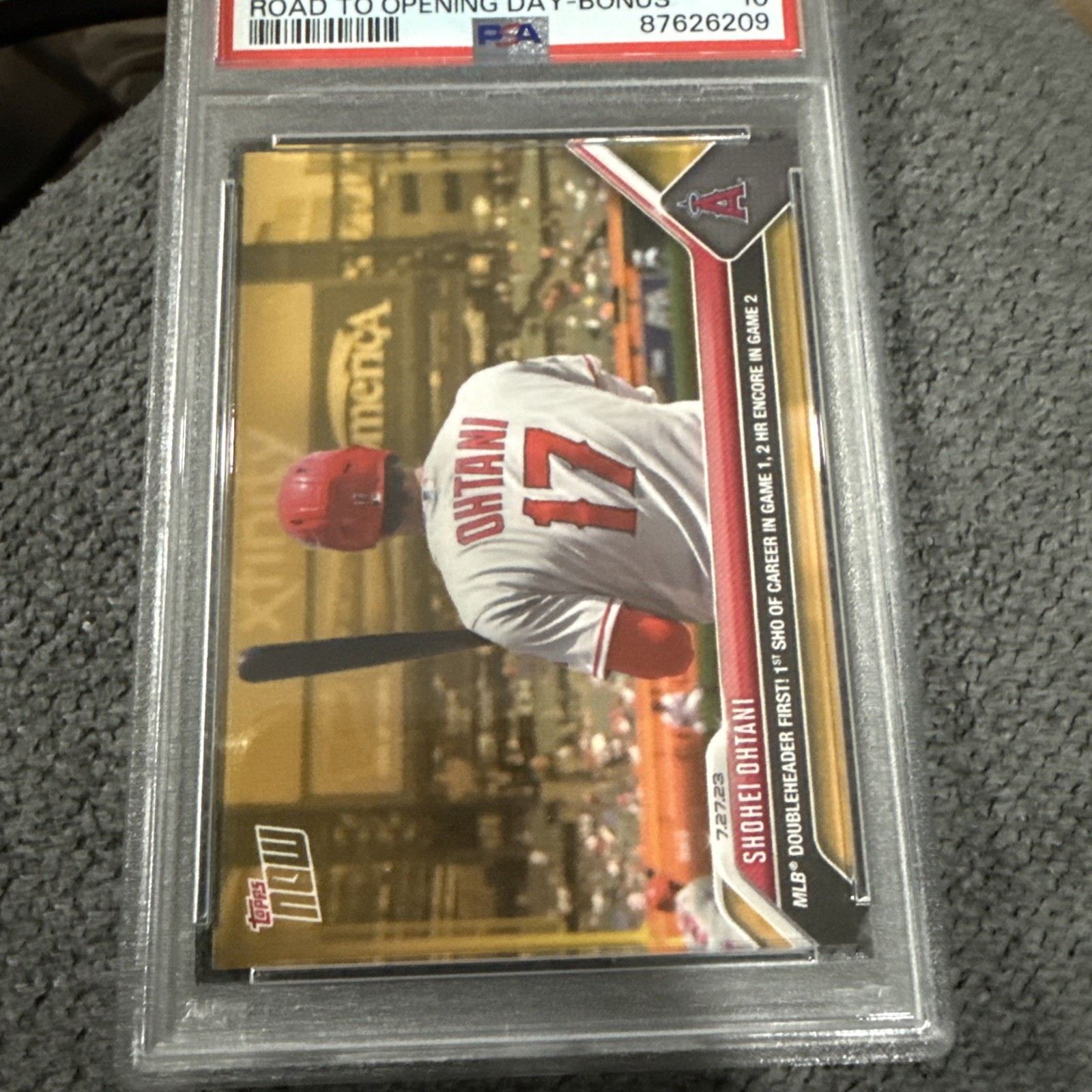 The product is a PSA 10 graded 2023 Topps Now Road to Opening Day Bonus Card #ODB-26 featuring Shohei Ohtani, a Major League Baseball player from the Los Angeles Angels. This original sports trading card is part of the Topps Now Road to Opening Day series, specifically showcasing Ohtani as a standout player in the MLB World Series. With its short print status and professional grading by PSA, this card is highly sought after by collectors for its rarity and pristine condition.