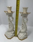This is a pair of vintage Lenox candle holders featuring a dolphin design adorned with 24K gold trim. The candle holders stand at a tall 10 inches in height and width, with a glossy cream finish adding an elegant touch to the overall look. Perfect for collectors or those seeking decorative pieces with a touch of sophistication, these candle holders embody the classic Lenox quality and charm in their design.