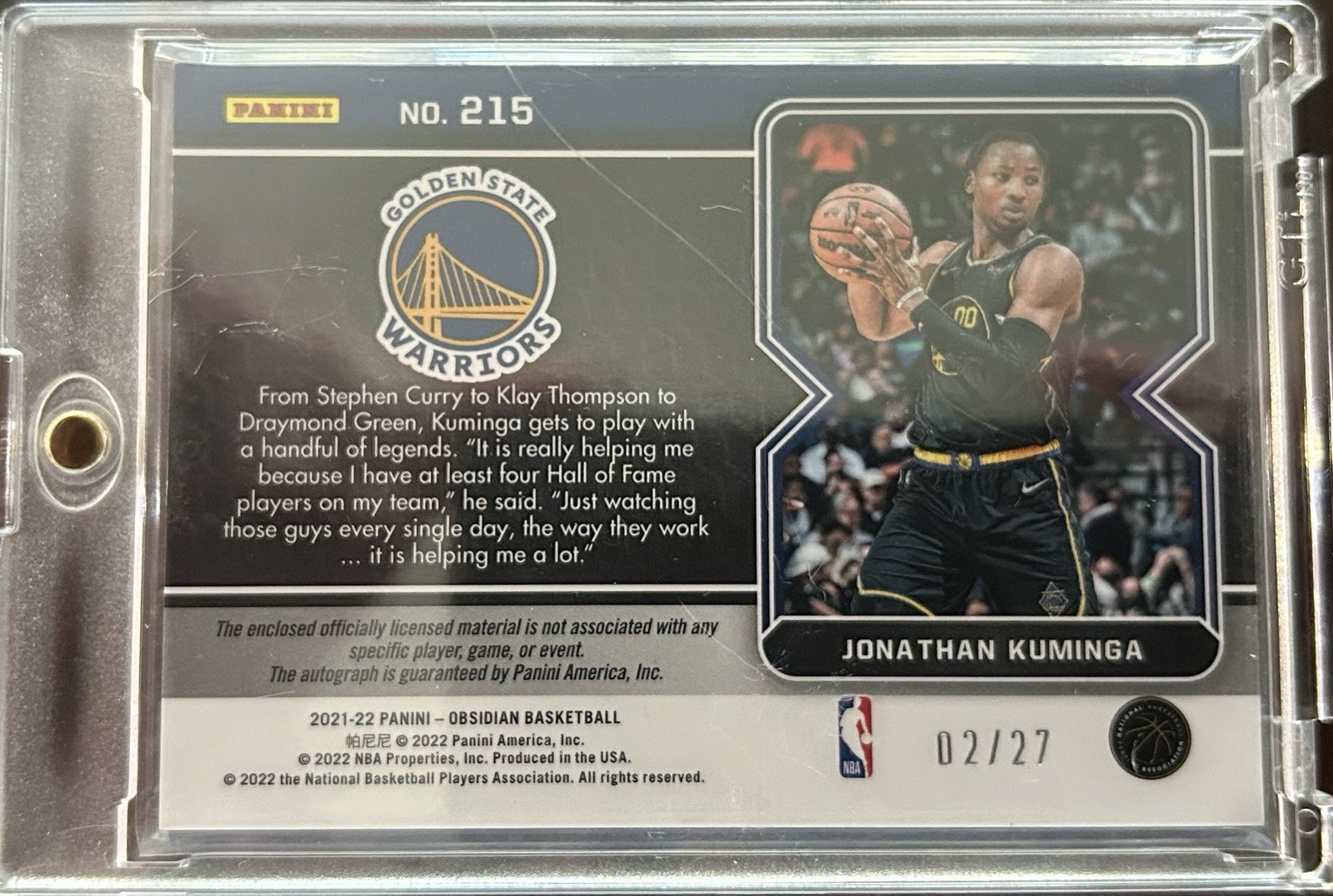 The product is a 2021-22 Panini Obsidian Basketball card featuring an autograph of Jonathan Kuminga, a rookie player for the Golden State Warriors in the NBA. This limited edition card is signed with a sticker and is part of a print run of only 27. The card is made of card stock and includes a signed memorabilia patch, making it a valuable addition for fans and collectors of basketball trading cards.