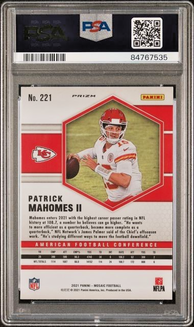 Patrick Mahomes II PSA 10 Gem Mint Camo Pink Prizm AFC Variation 2021 Panini Mosaic #221 NFL Kansas City Chiefs Football MVP Graded Slab Collectible Sports Trading Card