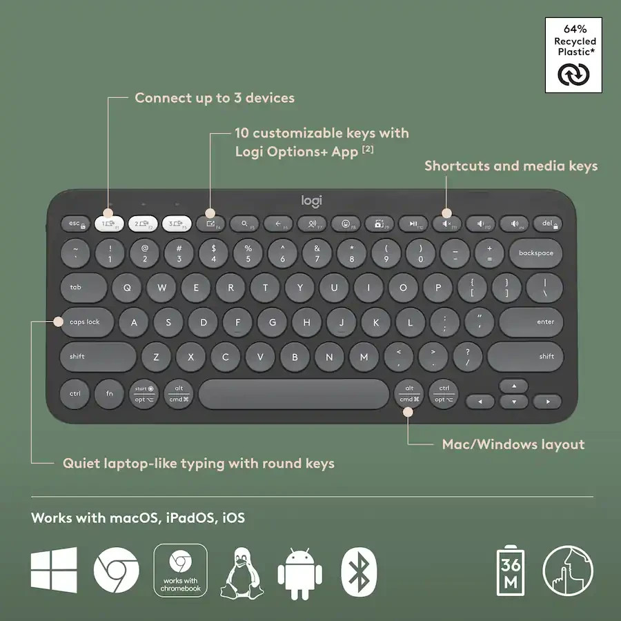 The Logitech Pebble Keys 2 Slim Wireless Scissor Keyboard is a sleek and portable keyboard that offers a QWERTY layout for easy typing on all devices. With wireless connectivity options like Bluetooth and USB-C, this keyboard is versatile for use with a variety of devices. Its slim design and illuminated keys make it convenient for use in any lighting conditions, while the quiet keys ensure a discreet typing experience. Made of durable plastic and featuring an English keyboard language, this Logitech keyboard is the ideal choice for those looking for a reliable and efficient typing solution. What's Included Pebble Keys 2 K380s keyboard, 2 X AAA batteries (pre-installed), User documentation