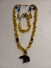 This Peridot Gemstone Bear Necklace Set features a charming design with polar bear-shaped main stones in a vibrant yellow color. The set includes earrings, a necklace, and a bracelet, all adorned with peridot gemstones. The main stone color and shape, as well as the overall theme of the set, create a unique and eye-catching jewelry ensemble perfect for adding a touch of whimsy to any outfit. Neaklace 17 inches Bracelet 6 inches Earrings 1.5 inches