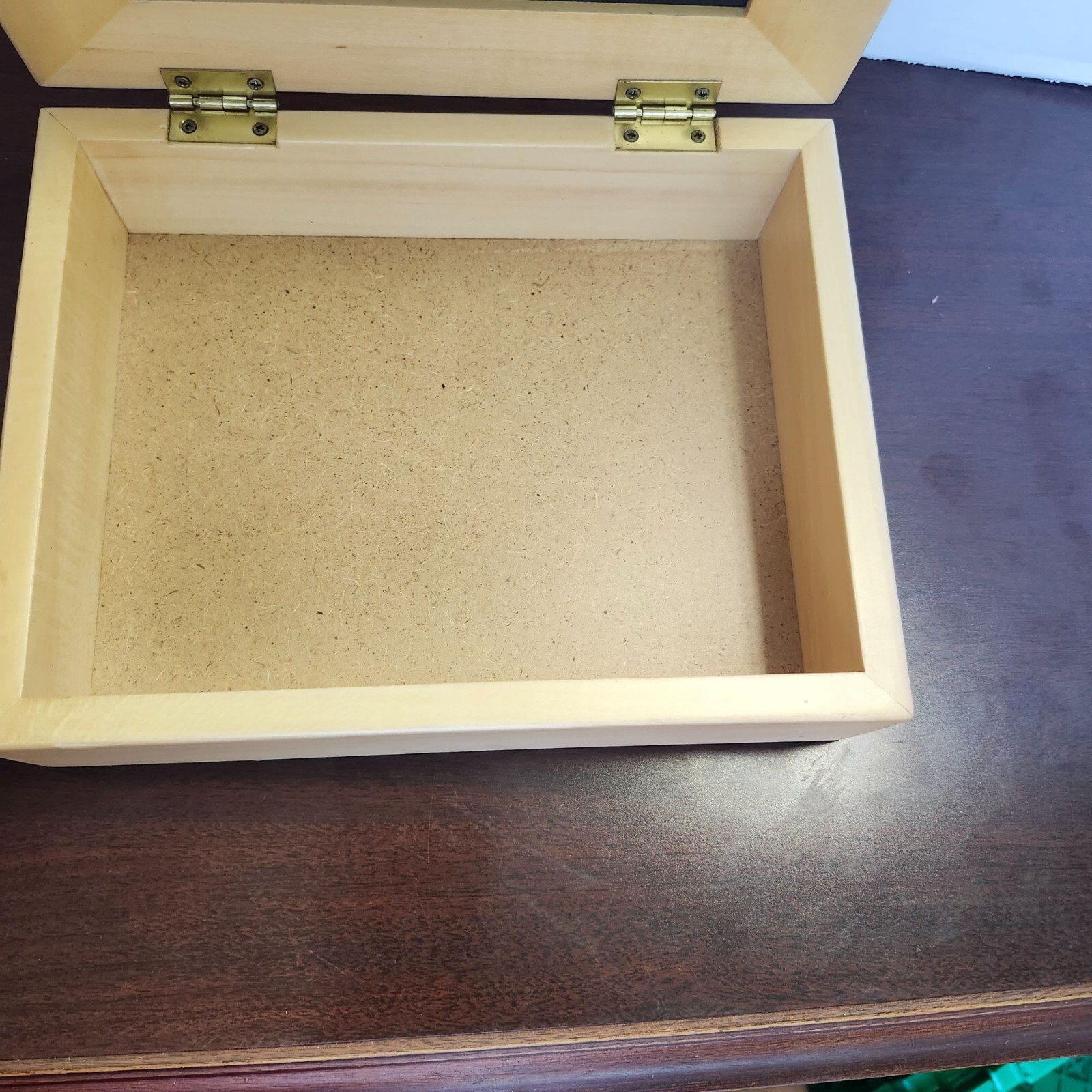 This wooden keepsake box offers a dual-purpose design with a picture frame lid. Ideal for storing small valuables or mementos. • Wooden construction • Hinged lid with picture frame (fits 4" x 6" photo) • Felt-lined bottom • Dimensions: 11" x 8" x 3" Wood has minor scuffs on the lid.