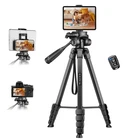 iPad Tripod 【 Phone Tripod with Universal 2-in-1 Tablet Holder】phone and tablet tripod comes with a 2-in-1 clip, can carry both cell phone (landscape/vertical) and tablet. Compatible with iPad, iPad Air, iPad Pro 10.2"/10.9"/11"/12.9", iPad mini, and many other tablets. For smartphones like iPhone15 14 13 12 11 Pro/XS/XR, Samsung, Xiaomi, Huawei, etc 【Multi-functional Tripod Kit & 3-Way Pan Head】Versatile camera tripod comes with Standard 1/4" screw mount, performs well with a wide range of devices, compatible with small cameras/DSLR/Gopro/webcams/ring light. Stable and smooth 3-way pan head can freely adjustable angles for 360° panoramic shooting, 180°up & down shooting, and 90°vertical portrait , which can satisfy all the needs of vertical, horizontal, and overhead photography, etc 【Wireless Remote Shutter】Phone tripod stand is equipped with a wireless remote, easily connect your phone (iOS and Android), tablet, camera.It allows you to conveniently capture photos and videos from a distance of up to 33ft/10m. No need to touch, you can easily realize photo shooting, video shooting 【Stable Tripod Adjustable Height】Tripod stand easily extends the tripod height (from 16.9 inches to 68 inches) by adjusting the quick-release leg locks, perfect for various photography heights. Non-slip rubber feet provides strong stability, withstand up to 9.3 pounds of pressure. It provides reliable support for various photography needs, selfies, camera photography, live streaming, vlogging, pursuing fitness activities or practicing dance 【Portable Travel Tripod】 Tripod stand comes with a convenient storage bag, lightweight and compact, weights 1.65lbs, folded size is 15.7 inches, and it's easy to transport and store