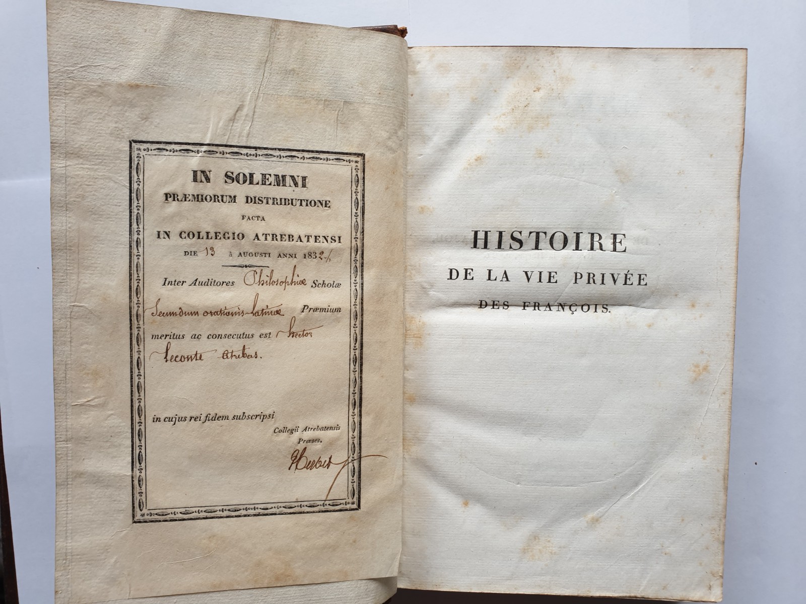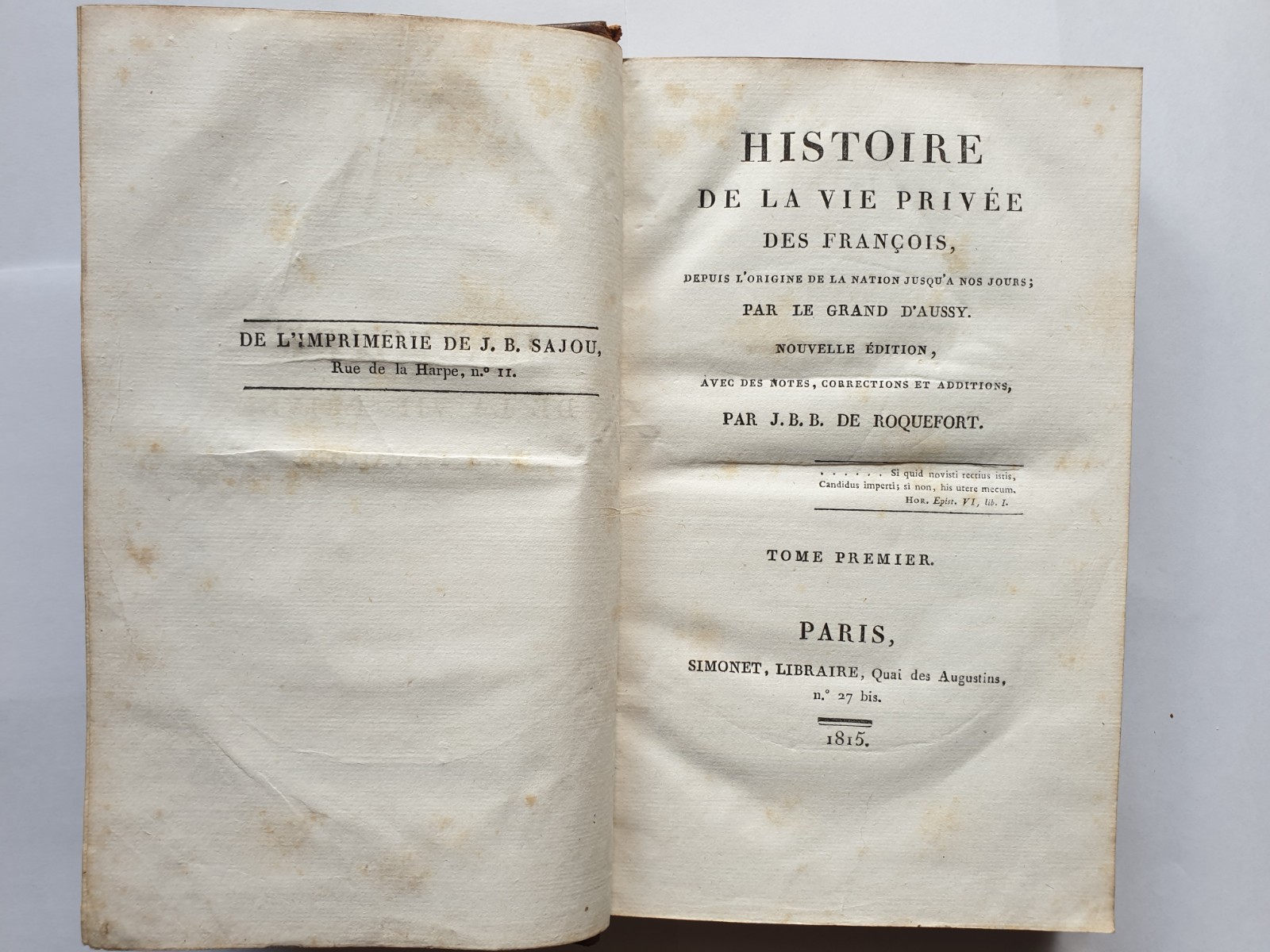 Histoire de la Vie Privée des François, depuis l'Origine de la Nation jusqu'à nos Jours [ Histoire de la Vie Privée des Français ] Author: LE GRAND D'AUSSY ; (ROQUEFORT, J. B B. de) Publication: Paris: Simonet Edition: 1815 Pages: VI-448 ; 431 ; 481. Description: Full calf, title in gilt on spine over red morocco, decorative gilt on spine. Marbled leaf ends. Marbled end papers. Generally clean copy inside.