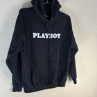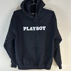 This is a stylish and comfortable Playboy hoodie in black, perfect for activewear or casual wear. It features a drawstring front for an adjustable fit and convenient pockets for storage. The long sleeves are great for cooler weather, and the solid pattern and large Playboy logo add a touch of flair. Made from high-quality cotton and with no signs of wear and tear, this hoodie is perfect for anyone who values both style and comfort. The size L hoodie is designed for women and is a regular fit. The brand is well-known and trusted, ensuring a quality product.