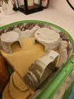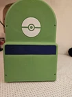 Get ready to catch 'em all with this Pokemon backpack playset! Perfect for any young fan of the popular TV show, this green plastic backpack features the iconic Pokemon franchise and is sure to become a favorite accessory. The playset includes a variety of moving parts and expands into a much larger play area. This set is in good play condition - a few wear marks on the outside, and it appears to be missing a bridge piece to connect the sides. All the moving pieces seem to be intact, would be great for a gift for a child with pokemon figurines, or for an adult for a walk down memory lane.