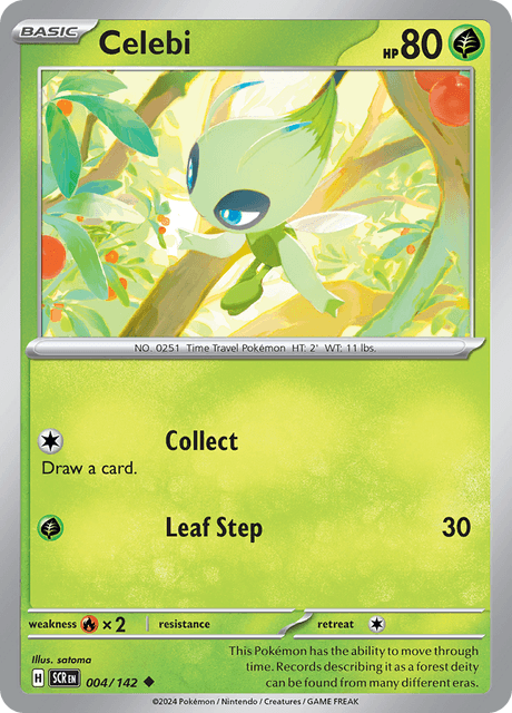 This cute set includes the following six cards with a standard card finish, all near mint or better condition: Celebi- Stellar Crown Jirachi- Stellar Crown Keldeo- Temporal Forces Victini- Temporal Forces Shaymin- Temporal Forces Phione- Twilight Masquerade Thanks for considering my item! I am a collector myself and pack my cards exactly how I would want to receive them. Each card is shipped with ample padding and protection, no wiggle room allowed !