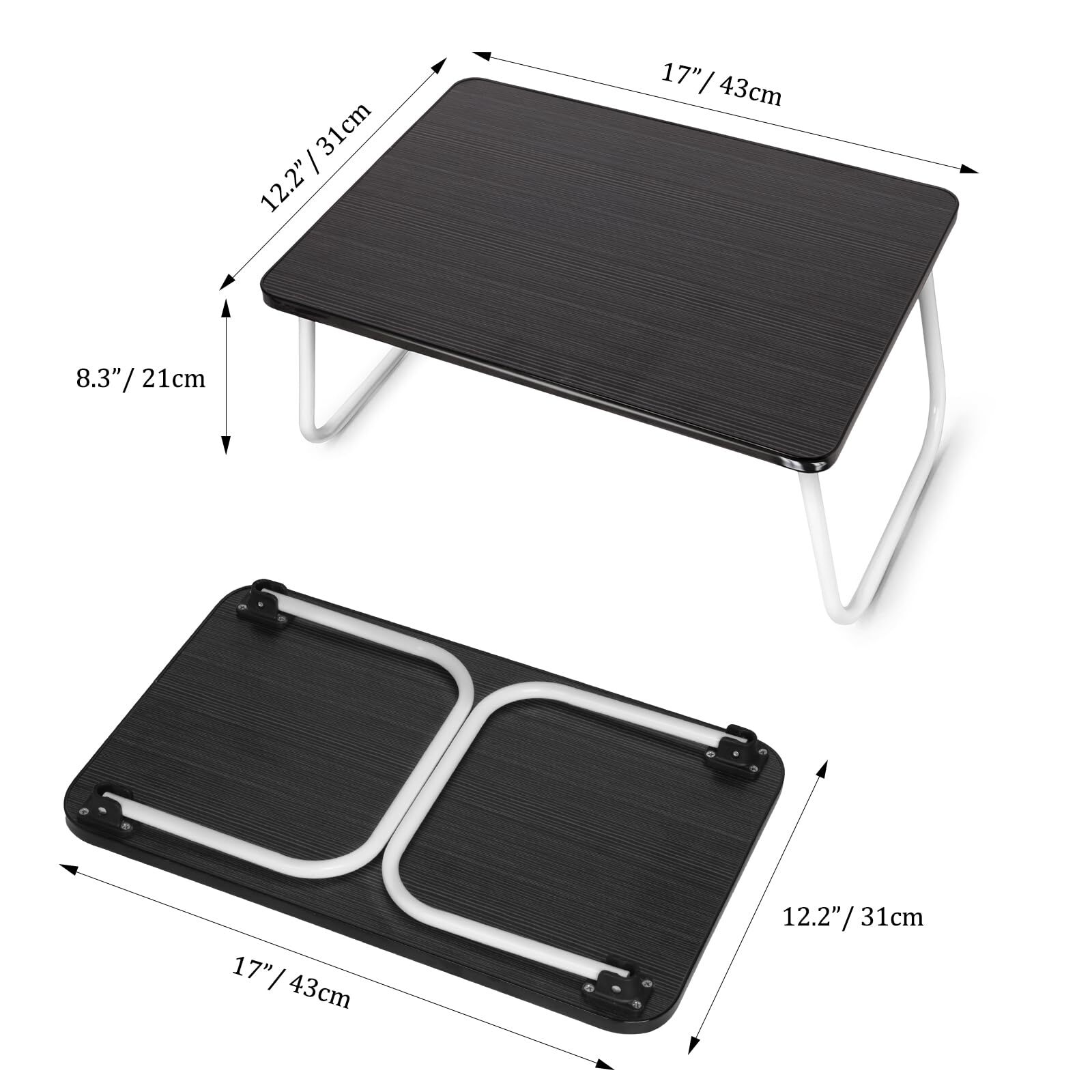MULTIFUNCTIONAL LAPTOP DESK: The small laptop tray allows you to enjoy your books,Internet,laptop and breakfast in bed,on the sofa or on the floor.Suitable for students,picnics,standing work or people who need to recover in bed after surgery. HIGH QUALITY MATERIAL: The lap desk is made of medium density fiberboard and round aluminum alloy tube frame.Lap table has been specially treated to be abrasion-resistant, scratch-resistant and water-proof. CONVENIENCE FOR ALL: After use,fold this down to a compact size and store it next to the sofa or under the bed without taking up too much space.Lightweight and easy to carry. NO ASSEMBLY REQUIRED: The laptop table does not need to be installed and can be used directly when opened.Product size: 17"(L) x 12.2"(W) x 8.3"(H). PERFECT AS A GIFT CHOICE: This bed tray is your best gift choice for children,family or friends.Feel free to reach to our customer service if you have any trouble with this product, your satisfaction is our priority.