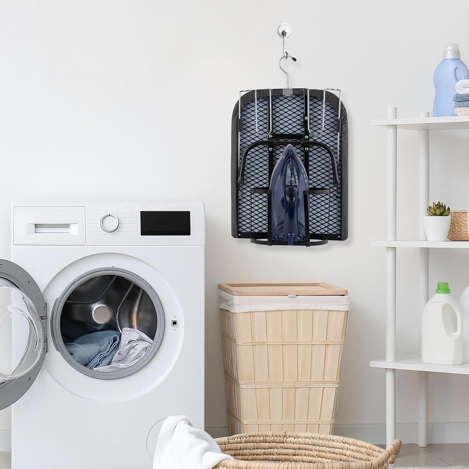 Wall Mount Ironing Board Hanger Wood Shelf Metal Basket Laundry Organization