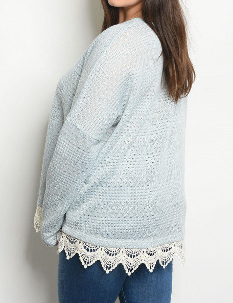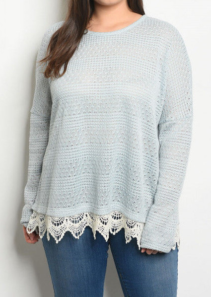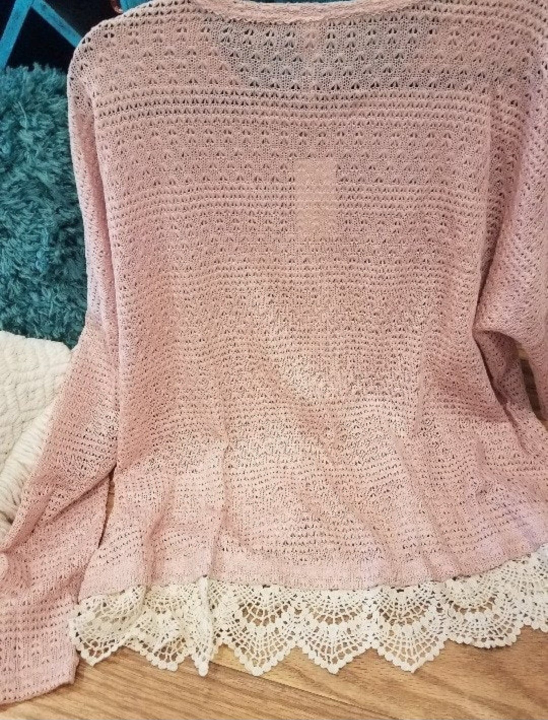 Darling Boutique sweater. Powder, textured open semi-sheer knit. Ivory crochet lace peeks out of the bottom hem for that layered look. So boho chic! (The model in the blue sweater is just to show the fit, this sweater is pink) PLUS SIZING Made of 80% rayon 20% poly NEW WITH TAGS!! SIZE 2XL BUST....APPROX 29" FROM ARMPIT TO ARMPIT LENGTH...APPROX 27.5" FROM TOP OF SHOULDER TO END OF TOP Measurements taken laying flat and unstretched