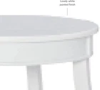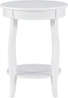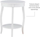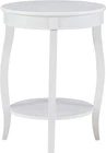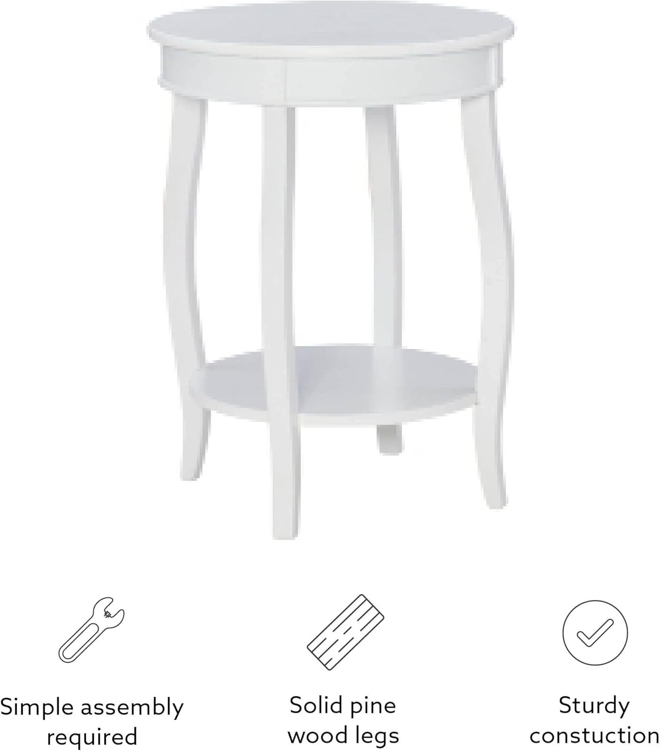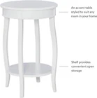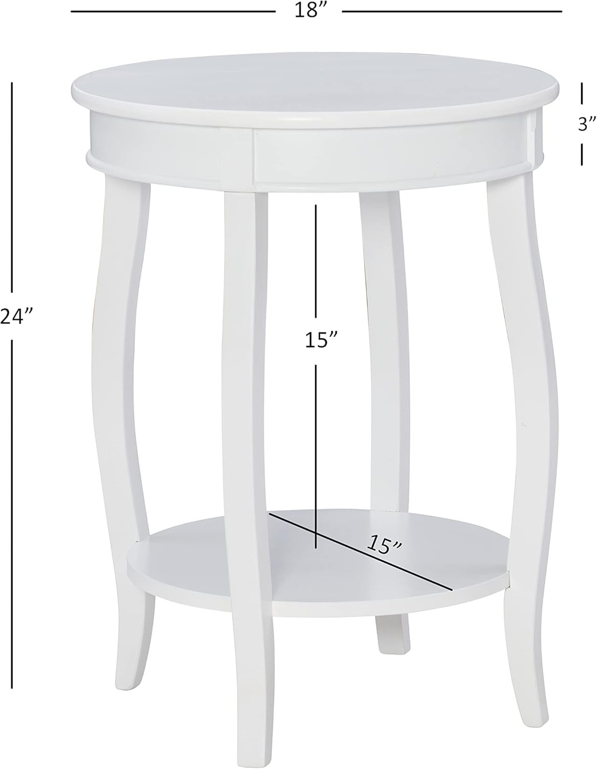 Powell Furniture Round Shelf, White Table, 18" x x 22" Tall Product Details Brand: Powell Product Dimensions: 18"D x 22"W x 18"H Maximum Weight Recommendation: 50 Pounds Color: White Product Care Instructions: refer to instructions Item WeightFrame Material: 14 PoundsWood Top Material TypeShape: Engineered WoodRound Perfect accent piece for any room in your home Provides ample storage space - Shelf weight limit of 15 lbs. Features bentwood skirt and saber cabriolet tapered legs White Finish and Sealed Some assembly required The contemporary White Round Table with Shelf is a convenient accent for any room of your home. A round lower shelf offers a convenient option for storing magazines, coasters or your favorite books. Made of select hardwoods and solid wood materials, the contemporary styling of this table has a bentwood skirt and four saber cabriole tapered legs. Some assembly required.