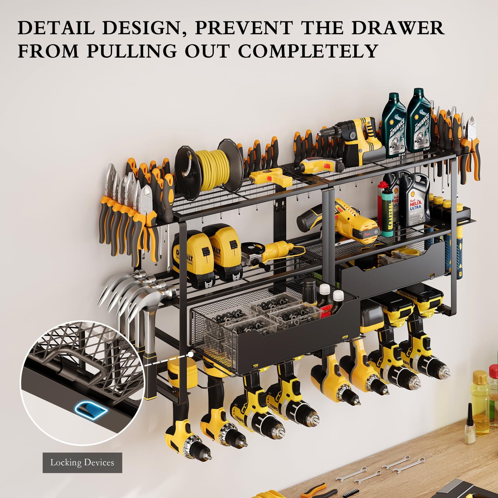 【Four Tiers High Capacity Storage】This tool shelf is designed with four tiers high capacity. The third tier are two pull-out drawers to increase the diversity of tools stored, the bottom tier can store 8 cordless drills, the top three tiers can store other heavy-duty tools or a variety of small tools, with hammer holders, pliers holders and screwdriver holders on the side. 【Strong Load-bearing Capacity】The garage tool organizer is made of thickened heavy-duty steel metal with greater load-bearing capacity and durability, it can be kept for a long period of time without deformation when storing tools, after extensive load testing, you don't have to worry about the shelf breaking or the power tool storage rack falling off the wall. 【Planned Space】This heavy duty tool organizer takes full advantage of wasted wall space to display and place your handheld tools into a compact and efficient area. This drill holder wall mount tool manager helps you keep all your frequently used project tools neatly organized and within reach. This is not only a space saver, but a greater time saver in finding your tools. 【Easy to Install】The power tool organizer has a detachable design, refer to the professional installation manual, you just need to attach the steel frame and screws, then hang it on the wall. It only takes a few minutes to assemble the heavy tool organizer on the wall in your garage, workshop or studio. 【Optimized Details】The edges of each piece of metal on this garage tool organizer are polished and rounded, so your fingers won't get scratched. Each slot slopes upward in the front to ensure your tools won't slide out.