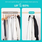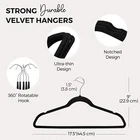 Non-Slip Design - The specially developed shoulder line is added to promise worry-free preservation of the clothing's shape. There are grooves on each shoulder that can be used to hang clothes with thin shoulder straps, great without slipping off tightly for your tank tops, dresses, bras, ties, belts, nightgowns, shawls, and skirts Space Saving Design - The ultra-thin design with an optimal size of 17.5"L x 1/4"W x 9"H each hanger maximizes the storage space and makes full use of your wardrobe and room to make it clutter-free. Increases closet space by up to 75 percent. A galvanized metal hook with a 360-degree swivel meets your different hanging angle needs, good for easy clothing sorting, a perfect combination Durable & Sturdy - Crafted from high standard grade ABS Plastic that has been enhanced over time. Rest assured it will steadily hold heavy clothing of up to 11lbs. A durable black velvet hanger that is sturdy and durable enough to fully meet your daily needs of hanging coats, suits, long skirts, shirts, T-shirts, etc
