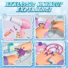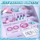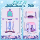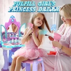 RICH ACCESSORIES: This kid vanity set includes electric hair dryer, hair band, comb, perfume, 3 x nail polish, 2 x lipstick, 3 x ring, 2 x hair clip, necklace, 2 x bracelet and stickers PRINCESS DREAM VANITY: Featuring castle-shaped mirror and openable doors, this child makeup table is equipped with lights and sound effects, as well as a cute stool, perfect for little girls to sit down and dress up REALISTIC DRESS UP TOYS: The simulated electric hairdryer allows little girls to learn to brush and blow dry their own hair, and develop beauty interest, fashion sense and self-confidence by pretending to paint nails, put on lipstick and wear jewelry LEARN BY PLAYING: This toddler vanity set is suitable for your little princess to invite friends to play together, which will develop their social and communication skills, improve hand-eye coordination, and encourage girls' imagination and creativity SAFE & HIGH QUALITY: We prioritize your child's safety, so our girl vanity is crafted from sturdy plastic, non-toxic paints and polished smooth edges to ensure safe and long-lasting pretend play time BEST GIFT FOR GIRLS: Every little girl loves to imitate her mom to dress up and wants to have her own makeup table! This cute girl toy gift is perfect for 3 4 5 years old girl's birthday/Christmas/princess party