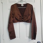 Princess Polly Brown Satin Cropped Top Size Large. Rhinestone studded center ring, long sleeve with slit at cuff. Side zipper close. Rich brown satin - photos against door are most representative of color. Great alone or over a bodycon top or dress. Boho Whimsigoth Fairygoth vibes. Excellent condition. Returns accepted - buyer pays return shipping.