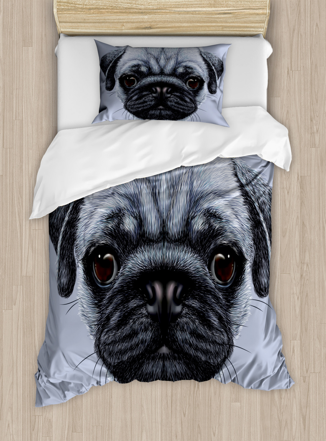 Pug Duvet Cover Set King Size Young Puppy Giant Eyes with 2 Pillow Shams Time to embrace modern looks, feel-good fabrics, and high-quality materials! King, queen, or twin - these 3 pcs duvet cover sets will work in any bed for any season! Woven from 100% brushed microfiber fabric, our duvet cover collection is constructed for maximum strength and ultra comfort only for you and your beloved ones. All you need to do is to simply put our duvet cover on your comforter and secure it with zipper closure, and enjoy your new bedding set! MEASUREMENTS: KING SIZE SET: Duvet Cover (104" W X 88" L) and 2 Pillow Shams (36" W X 20" L). QUEEN Size Set: Duvet Cover (88" W X 88" L) and 2 Pillow Shams (30" W X 20" L). Twin Size Set: 1 TWIN Duvet Cover 68" X 88" + 1 Pillow Sham 30" X 20". The duvet cover FEATURES hassle-free hidden zipper and the pillow shams have an envelope closure. Please note that COMFORTER NOT INCLUDED IN THIS SET. This only duvet cover, allowing you to protect the comforter/duvet insert from dust, mites, and other stains. WRINKLE FREE - The microfiber material creates ultimate softness and comfort, also provides wrinkle, fade, and shrink resistance when properly cared for. Very durable and sustainable material that will not endanger your health or the environment, either. No chemicals used, No dye substance harming the health of you or your family, %100 microfiber recyclable environmentally friendly fabric. LOW MAINTENANCE: Machine washable in cold water. Suitable for tumble dryer use on low heat. Can be ironed on medium heat when necessary. Do not bleach. Choose your style between thousands of different and creative patterns. Or simply find your perfect gift idea ever for housewarming, birthday, bridal shower, Christmas, Mother’s Day, and newlyweds… You can find a theme for everybody and every interest in our Ambesonne Store. The images we display have the most accurate color possible but, due to differences in pc monitors, there can be slight color differences between the product and the image. Due to manual measurement, please kindly allow 1-2 cm discrepancy. The Duvet Cover and Pillow Shams are printed on the FRONT SIDE ONLY, the back of them are PLAIN WHITE-COLORED. This is ONLY the Duvet Cover, sold WITHOUT the Comforter.
