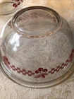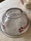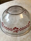 Add a touch of vintage charm to your kitchen with these Pyrex Red Cherries Cherry Gingham Checkered Glass Mixing Bowls. The set includes three round bowls in sizes 322, 323, and 325, all featuring a beautiful cherry and gingham pattern with clear glass material and red details. These bowls are stackable and decorative, perfect for all occasions and hand wash only care instructions. The bowls were manufactured in the United States in the late 20th century, specifically in 1980, and are an original pressed glass production style. The bowls weigh 10.8 lbs and have a backstamp impressed. They belong to the Red Cherries product line and have a mid-century modern style. These bowls are a great addition to any collection and are sure to catch the eye of any collector. Minimal scratches on glass Cherrie pattern still vibrant Nice set