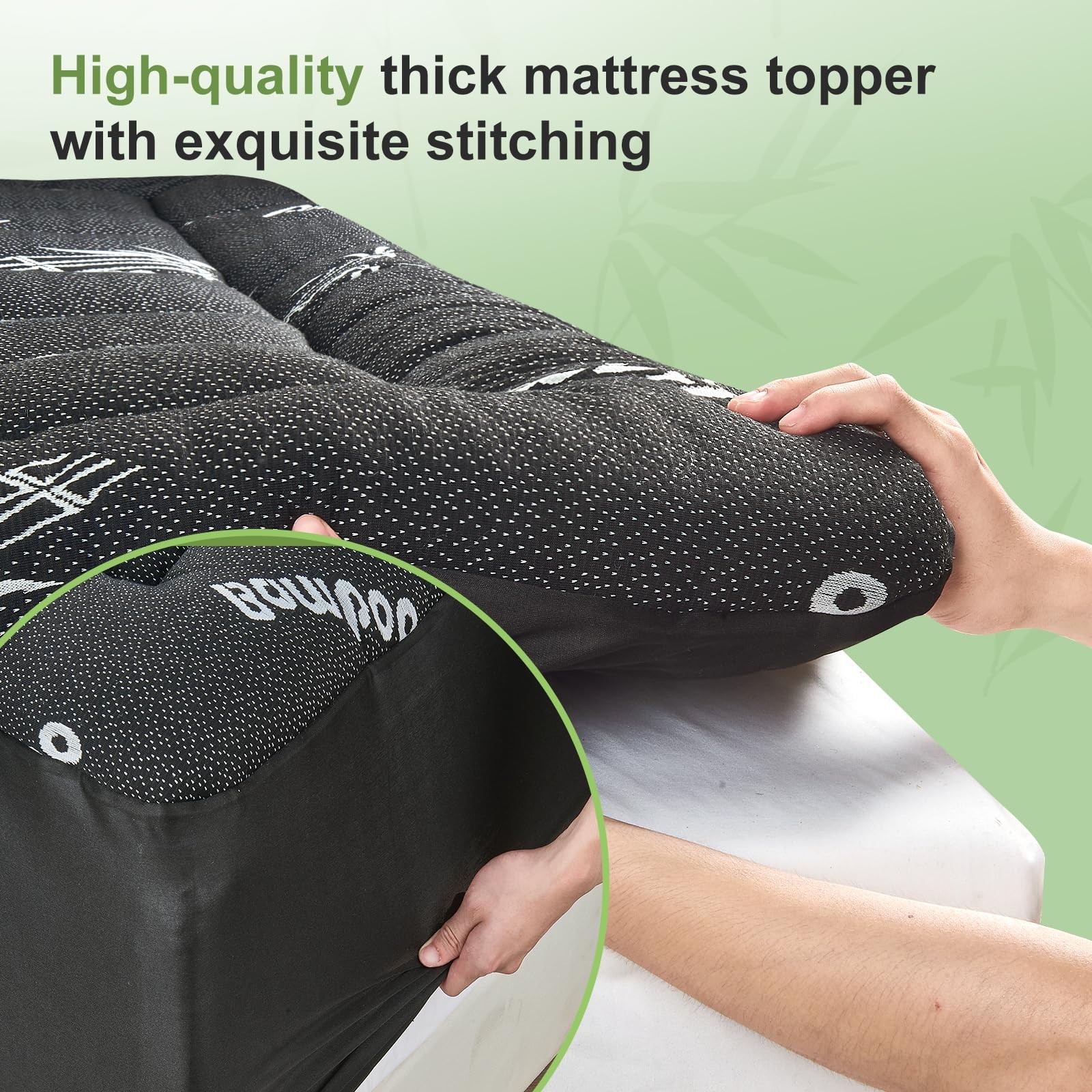 Queen Size Mattress Topper Viscose Derived from Bamboo, Soft Thick Pillow Top Mattress Pad Cover for Back Pain, Overfilled Cooling Mattress Protector with 8-21 Inch Deep Pocket, Dark Grey Breathable & Comfort - The cloud-like surface with 40% Viscose Made from Bamboo and 60% Polyester made Three Dimensional Structure that makes the air circulate, gives superior comfort and cooling without extra heat and sweat caused by memory foam or traditional mattresses Luxury Soft Mattress Topper - Mattress topper uses snow down alternative filling that can make you feel soft & fluffy and provide back pain relief and a layer of full body support. Viscose made from bamboo surface can refresh your mattress, distribute heat evenly, and provide a more skin-friendly feel No-Slip & Deep Pocket - Stretchable knitted skirt design is deep enough to fit securely mattress depths 8"-21" and also suitable for air mattresses. However you toss and turn, the corners just stay on place and don’t come up from the mattress High Quality & Easy Care - Our thick mattress pad is durable, no risk being ripped even with frequently washing. Machine wash separately in cold water. Tumble dry on low heat or line dry. Do not bleach. Wash them regularly to keep your mattress clean and free of stains keeps it smelling fresh and helps you to keep you healthier Customer Satisfaction - We provide a 365-day satisfaction . If you are not satisfied with the product during use, please the team directly or us to obtain a satisfactory solution