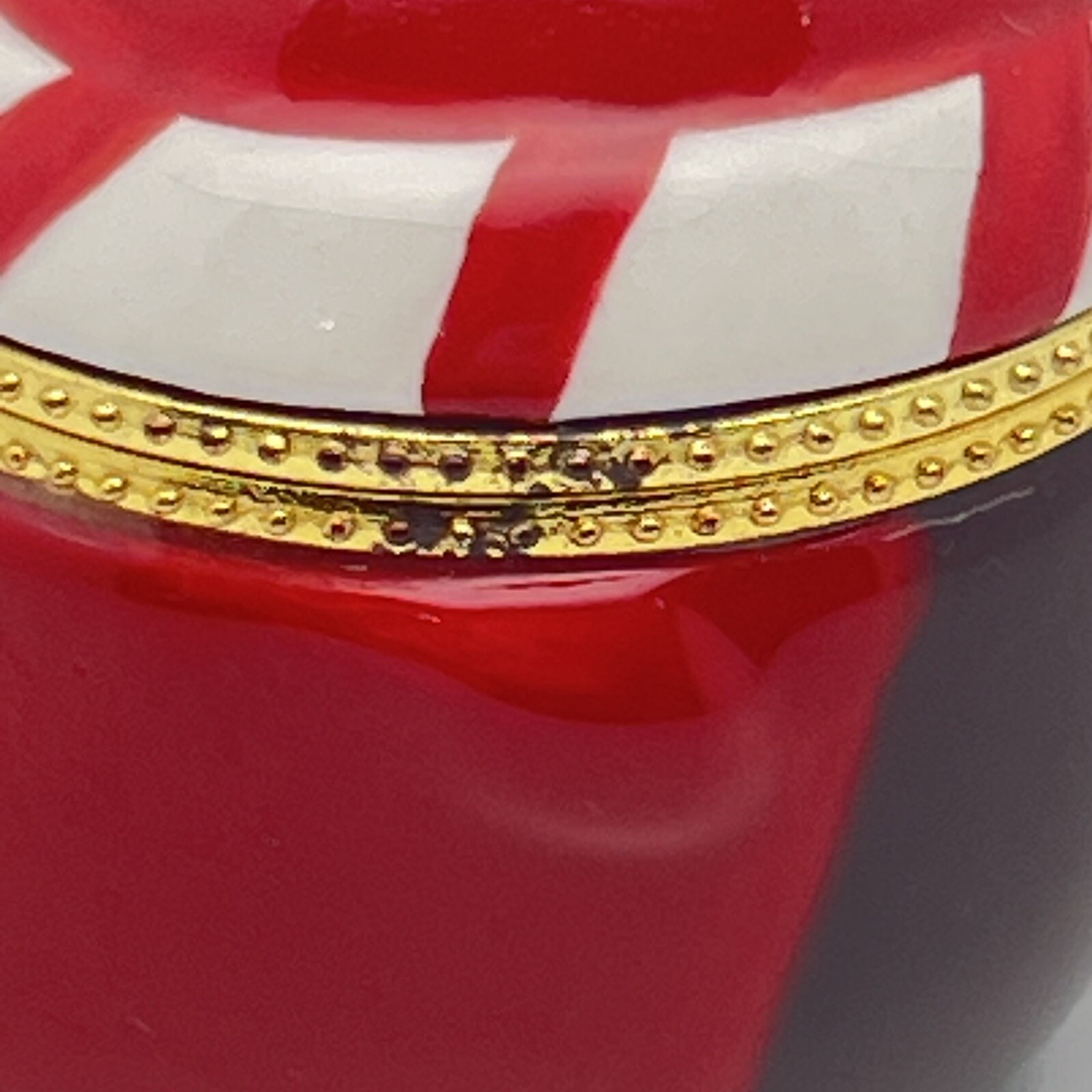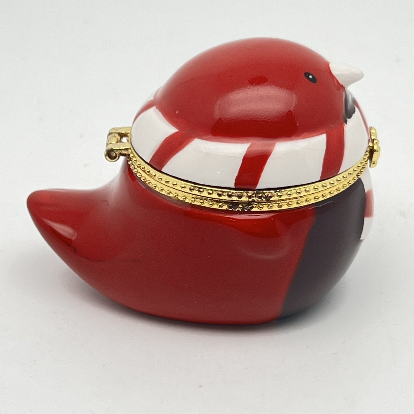 Hinge works great. There is a little tarnish on the gold- see pics. We pack safely and ship quickly. Please let me know if you have any questions and thank you for shopping with me!🌼 RED ROBIN BIRD KEEPSAKE HINGED TRINKET BOX - GOLD TRIM BABY CARDINAL CHRISTMAS.