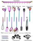Cooking Utensil Set 37 Pieces Included: 1 Ladle, 1 Skimmer, 1 Slotted Turner, 1 Pasta Server, 1 Cooking Spoon,1 Potato Masher, 1 Egg Whisk,1 Slotted Spoon, 1 Cooking Tong, 1 Flat Turner, 1 Flexible Spatula, 1 Basting Brush, 5 mesuring cup,5 mesuring spoons,1 Kitchen Utensil Rack with 14 Utensil Removable S Hooks.Meet your all kinds of kitchen needs. Durable And Fashion Design:This cooking utensil set designed for functionality. Kitchen Utensils designed using top-grade stainless steel and plating with titanium rainbow make it looks glory and luxury. It would raise up your kitchen decoration. Heathy Material: This cooking utensil set is made of high quality stianless steel, Lead-free, PBA-free, Healthy for daily cooking. Best Kitchen Tools:A variety of accessories can perfectly solve your cooking needs. It can be used not only in the family, but also in hotels, restaurants and other places. The high-quality materials and fine workmanship can also be regarded as a perfect gift. Dishwasher Safe:The kitchen utensil set is made of high quality stainless steel, It is durable and strong anti-rust.Wipe clean and keep it dry after using, Use soft cloth to clean and wash, Do not use hard material to wash and rub the utensil for keep it always shiny. It can last for years.