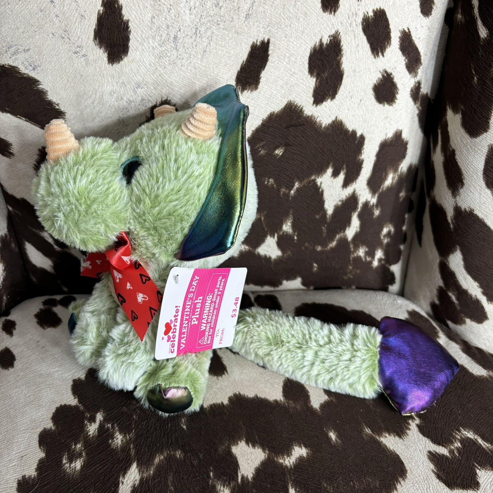 Way To Celebrate! Rainbow Holographic Ribbed Triceratops Valentines 7” Plush NWT Brand new with swing tags and tush tags intact. No tears/holes or stains on plush. Measures about 6.5”-7” tall. Light green triceratops dinosaur plush with ribbed beige horns, rainbow holographic spine and tail spike and a red ribbon/bow around its neck with hearts on it. One side of ribbon has light fraying.