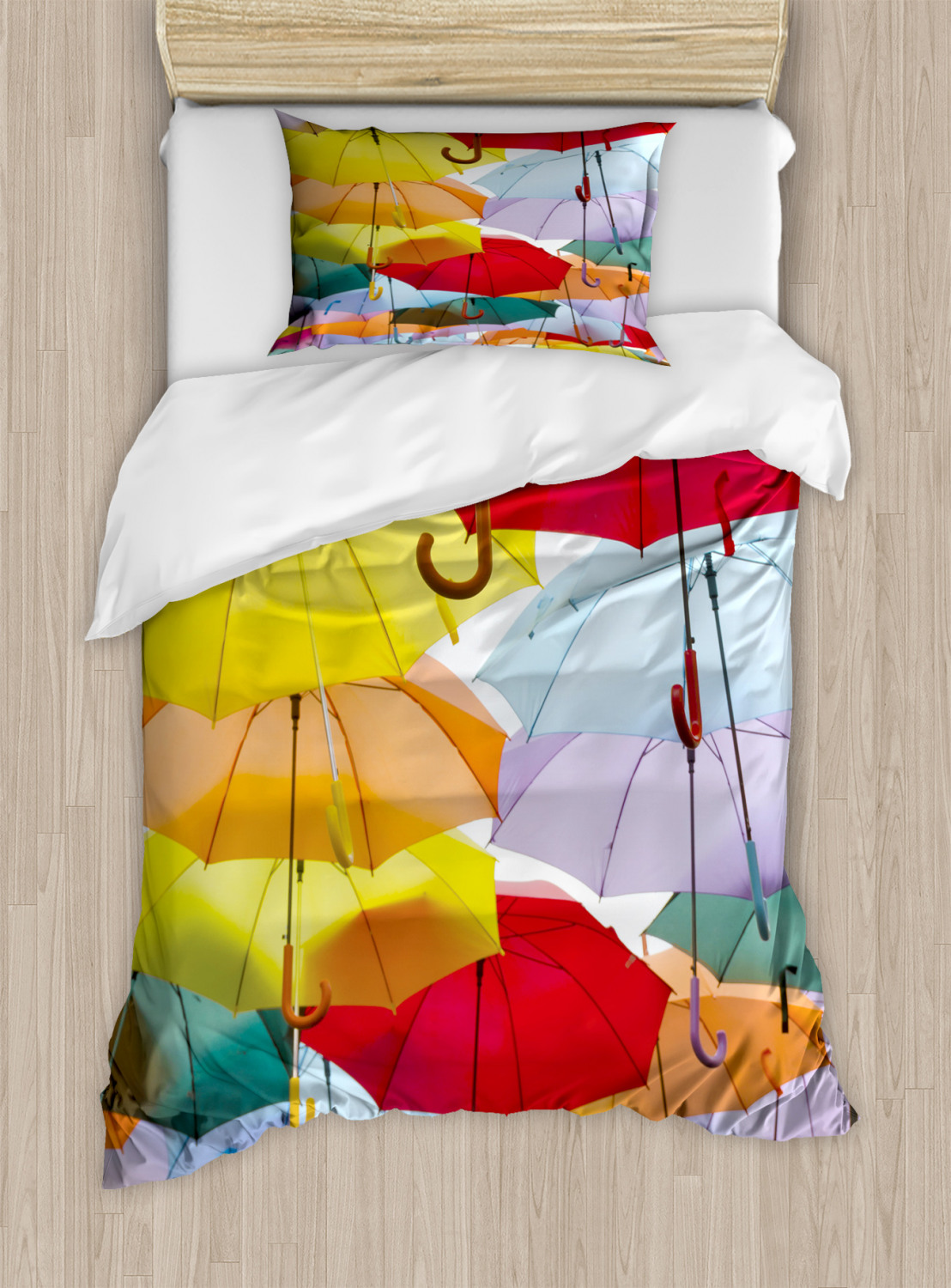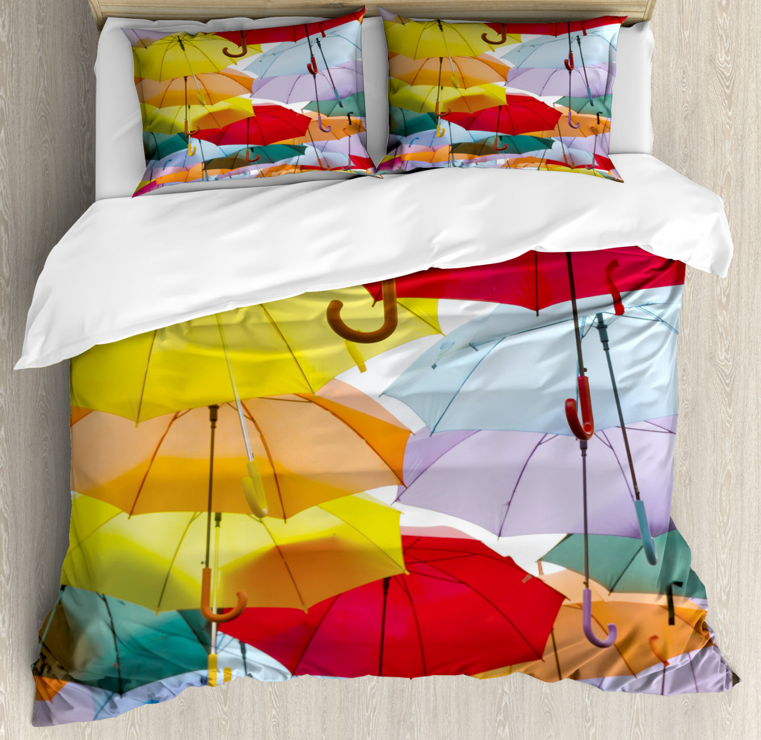 Umbrella Duvet Cover Set King Size Rainbow Parasols with 2 Pillow Shams Time to embrace modern looks, feel-good fabrics, and high-quality materials! King, queen, or twin - these 3 pcs duvet cover sets will work in any bed for any season! Woven from 100% brushed microfiber fabric, our duvet cover collection is constructed for maximum strength and ultra comfort only for you and your beloved ones. All you need to do is to simply put our duvet cover on your comforter and secure it with zipper closure, and enjoy your new bedding set! MEASUREMENTS: KING SIZE SET: Duvet Cover (104" W X 88" L) and 2 Pillow Shams (36" W X 20" L). QUEEN Size Set: Duvet Cover (88" W X 88" L) and 2 Pillow Shams (30" W X 20" L). Twin Size Set: 1 TWIN Duvet Cover 68" X 88" + 1 Pillow Sham 30" X 20". The duvet cover FEATURES hassle-free hidden zipper and the pillow shams have an envelope closure. Please note that COMFORTER NOT INCLUDED IN THIS SET. This only duvet cover, allowing you to protect the comforter/duvet insert from dust, mites, and other stains. WRINKLE FREE - The microfiber material creates ultimate softness and comfort, also provides wrinkle, fade, and shrink resistance when properly cared for. Very durable and sustainable material that will not endanger your health or the environment, either. No chemicals used, No dye substance harming the health of you or your family, %100 microfiber recyclable environmentally friendly fabric. LOW MAINTENANCE: Machine washable in cold water. Suitable for tumble dryer use on low heat. Can be ironed on medium heat when necessary. Do not bleach. Choose your style between thousands of different and creative patterns. Or simply find your perfect gift idea ever for housewarming, birthday, bridal shower, Christmas, Mother’s Day, and newlyweds… You can find a theme for everybody and every interest in our Ambesonne Store. The images we display have the most accurate color possible but, due to differences in pc monitors, there can be slight color differences between the product and the image. Due to manual measurement, please kindly allow 1-2 cm discrepancy. The Duvet Cover and Pillow Shams are printed on the FRONT SIDE ONLY, the back of them are PLAIN WHITE-COLORED. This is ONLY the Duvet Cover, sold WITHOUT the Comforter.