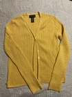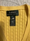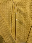 This is a yellow Ralph Lauren cardigan sweater for women in size Small. It features a ruffle hem, cable-knit style, long sleeves, collared neckline, and a button closure. Made of 100% linen, this sweater must be hand washed. The design includes pockets for added convenience. This classic and stylish piece is perfect for adding a pop of color to your wardrobe and staying cozy in cooler weather.