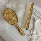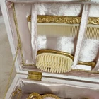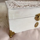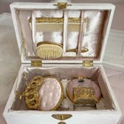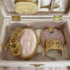 Antique Vanity Chest Pink and Gold Set Wooden Box Beauty Old Hollywood Glamour Shabby Chic 🦢Antique Vanity Box/Dresser Chest with Antique Set Inside/ all coated in 24k gold. ♡ Details: One-of-a-kind vanity/dresser chest filled with 24k gold vanity set. It has a vintage lipstick holder from the 50s restored with 24k gold(made by Sam Fink), 24k gold perfume bottle from the 40s, and 24k gold vintage brush set from the 50s. It also has a romantic lace holder from the 1800s to hold make-up brushes or absolutely anything! The inside of the chest has luxurious pink velvet that is laced with gold filigree rope to secure the contents inside. It is entirely handmade. The closure in the front of the chest also closes. La Pearl Antiques wanted to create the perfect gift with exclusive vanity tools inside that have been restored with 24k gold. ♡ It is in great condition! The listing is for all the contents in the chest and the chest itself. The perfect gift to avid antique collectors or someone in search of a one-of-a-kind gift! Perfect gift for a bride or Christmas! Its all antique and handmade/restored. These are all one- of a kind pieces. ♡ Measurements: CHEST 12x7.5x6 inches ♡ SHOP NOTICE: Every item in the store is unique and handpicked. Please beware that antiques have signage of age and imperfections! Check out the shop for announcements, new items and policies! 🦢