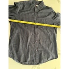 This rare vintage men's button-down shirt features a blue and tan striped pattern and long sleeves with buttoned cuffs. The collared neckline and buttoned closure add to the classic and versatile style, making it perfect for travel, casual outings, or business settings. The shirt is machine washable and made of a comfortable knit fabric consisting of polyester and cotton. It also includes accents such as pockets, and the cowboy-themed design adds a unique touch. The shirt is labeled as a size large and has a regular fit for a comfortable and flattering look. This shirt is a great addition to any wardrobe and is perfect for the winter, fall, and spring seasons. Excellent condition! See photos for measurements.