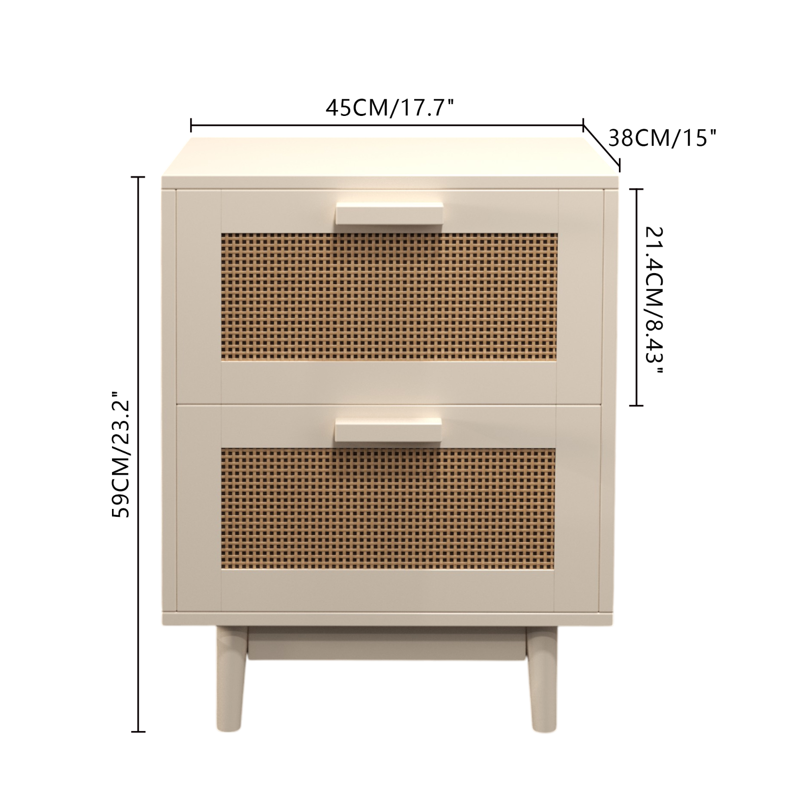 Product Features: Featuring expertly crafted rattan-style sliding drawers and a natural wood-tone finish, this bedside table combines functionality with aesthetic appeal. Though the rattan is synthetic, it mimics the texture and charm of natural materials, ensuring durability and easy maintenance. This versatile piece functions as a nightstand, bedside cabinet, or storage unit, meeting various bedroom storage needs. With clean lines and a timeless design, it complements a range of interior styles, adding understa 【Extra Large Storage】 SpaceThe rattan finish drawers combine beauty and practicality. The design, featuring two drawers and a wide tabletop, provides ample storage space for picture frames, alarm clocks, books, and daily necessities, keeping your bedroom or living room organized and tidy. 【Sturdy and Durable】Constructed from environmentally friendly MDF, this piece ensures strength and stability. Wood legs with non-slip feet protect floors from scratches and minimize noise when moving. The wooden surface is very easy to maintain and clean—just wipe it with a damp cloth. 【Multi-purpose】The Rattan Bedside Table is not only suitable for use as a bedside table and nightstand in the bedroom but also as a sofa side table and decorative side table in the living room. Suitable for both large and small spaces, it is versatile and can meet your different needs. 【Dimensions and Assembly】Overall product dimensions: 17.7"(L) x 15"(W) x 23.2"(H). Detailed instructions are provided to help you assemble the nightstand. The package includes assembly tools and a manual. By following the instructions, you can complete the assembly in no time.