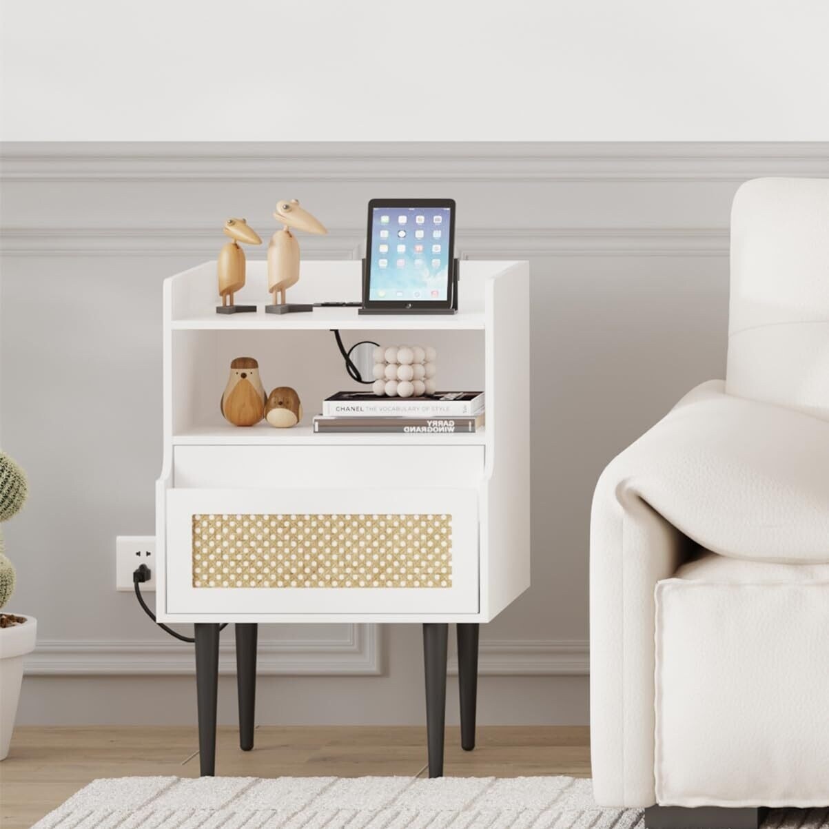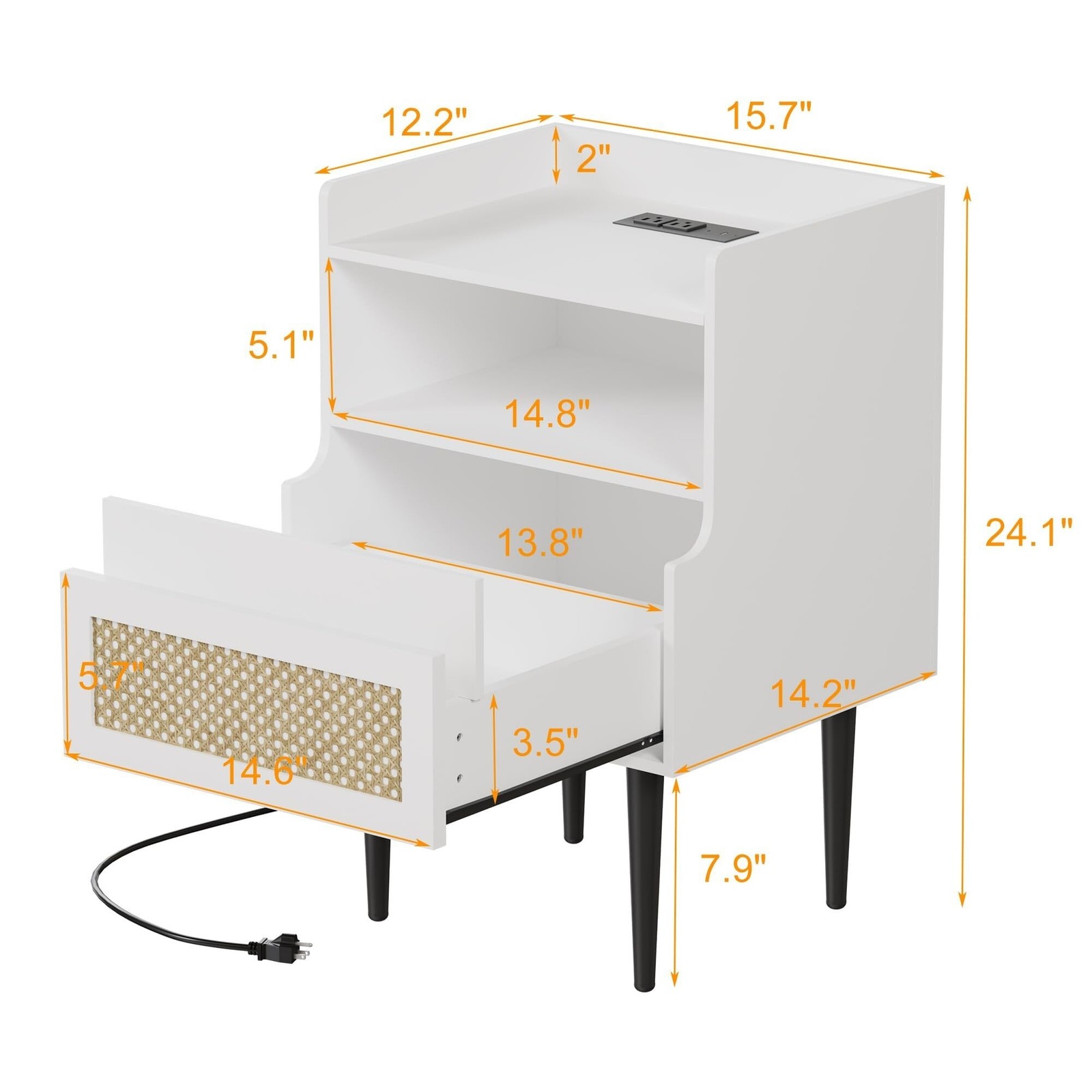 Sturdy Construction: Crafted with an MDF body, this modern side table ensures a robust frame can withstand the test of time; the solid legs provide unwavering support, guaranteeing stability for your everyday needs Ample Storage Space: The end table features a spacious desktop with raised edge to keep your items secure; with a large drawer and two open shelves, it offers generous storage capacity for all your items, making it a practical addition to any room Convenient Charging Station: This compact side table comes with 2 built-in outlets and 2 USB ports, providing an ideal charging solution for your mobile phone, smartwatches, lamps, and laptop, making your nightly routine more efficient Rattan Nightstand: This modern accent table boasts a beautifully embellished rattan drawer, adding a Free Shipping Over $49.99* Details Nightstand Set of 2, Rattan End Table with Charging Station, 2 Open Shelves Product Description: Sturdy ConstructionCrafted with an MDF body, this modern side table ensures a robust frame can withstand the test of time; the solid legs provide unwavering support, guaranteeing stability for your everyday needs Ample Storage SpaceThe end table features a spacious desktop with raised edge to keep your items secure; with a large drawer and two open shelves, it offers generous storage capacity for all your items, making it a practical addition to any room Convenient Charging StationThis compact side table comes with 2 built-in outlets and 2 USB ports, providing an ideal charging solution for your mobile phone, smartwatches, lamps, and laptop, making your nightly routine more efficient Rattan NightstandThis modern accent table boasts a beautifully embellished rattan drawer, adding a rustic and charming touch to your home decor, making it an ideal addition to any space, effortlessly enhancing your interior style Easy AssemblyThis rattan accent cabinet includes clear instructions and all the necessary hardware for quick and hassle-free assembly, allowing you to enjoy your new decorative cabinet in no time