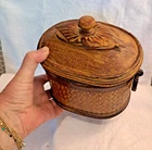Welcome to my collection of pre loved home decor and accent treasures. Downsizing household and handmade crafted items. This box was used to store my bulk tea, always in a plastic container, but can be used for many storage ideas. Well made .This Rattan & Wood Storage Box features a charming woven design with a carved leaf lid, perfect for tea or other small items storage. The medium-sized box is suitable for various occasions and rooms in your home, with a bohemian style and textured finish. Made of wood and rattan, this storage box has a lid for secure closure and is easy to clean with a damp cloth. Its unique design and brown color make it a lovely addition to any room, adding a touch of natural elegance to your décor.