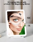 A 3-inch 10X Magnifying Mirror for Close-up: This lighted mirror is a regular mirror, coming with a 10x magnifying mini round mirror that clicks magnetically to the center, helping you with close-up tasks like tweezing eyebrows or applying liquid eyeliner or mascara coat. However, the round 10X zoom mirror blocks a big portion of the lighted mirror, so using it separately instead of always tacking it onto the glass is highly recommended. It can be hidden on the mirror back while not used. Super Bright Desk Mirror: Even illumination with 70 LEDs, the lighted vanity mirror softly illuminates every part of your face equally. With 3 color lights to pick from, a warm white light is best for applying makeup for a night out; a bright daylight setting for makeup for outdoor activities; and a cool light for a day spent in an office or classroom. This lighted beauty mirror will allow you to toggle between light temperatures to suit a variety of looks and situations. Book-Size Mirror Perfect Lightweight Travel Lighted Mirror: The mirror itself is only 0.7 pounds, 5.3 inches by 7.6 inches in width and height, and less than an inch thick, making it easy to packed in a bag or store in a luggage. Sufficient for makeup application and touch-ups for commute and 2-3 day business trip. The lighted makeup mirror is bright enough for daily use on vanity while it only takes up a small space. Rechargeable Lighted Compact Mirror: The mini LED mirror is rechargeable with 1000 mAh battery, you can use it cordlessly. If you need something for on-the-go use, this lighted travel mirror is highly recommended. You don't have to struggle with lighting but honestly it did help makeup application much more then a hotel mirror. USB-C cable is included, charger is not. The lid of the lighted makeup mirror works as a stand while used as a light-up tabletop mirror, and doesn't wobble when placed on a flat surface. You can use it as a compact travel makeup mirror with lights as well.