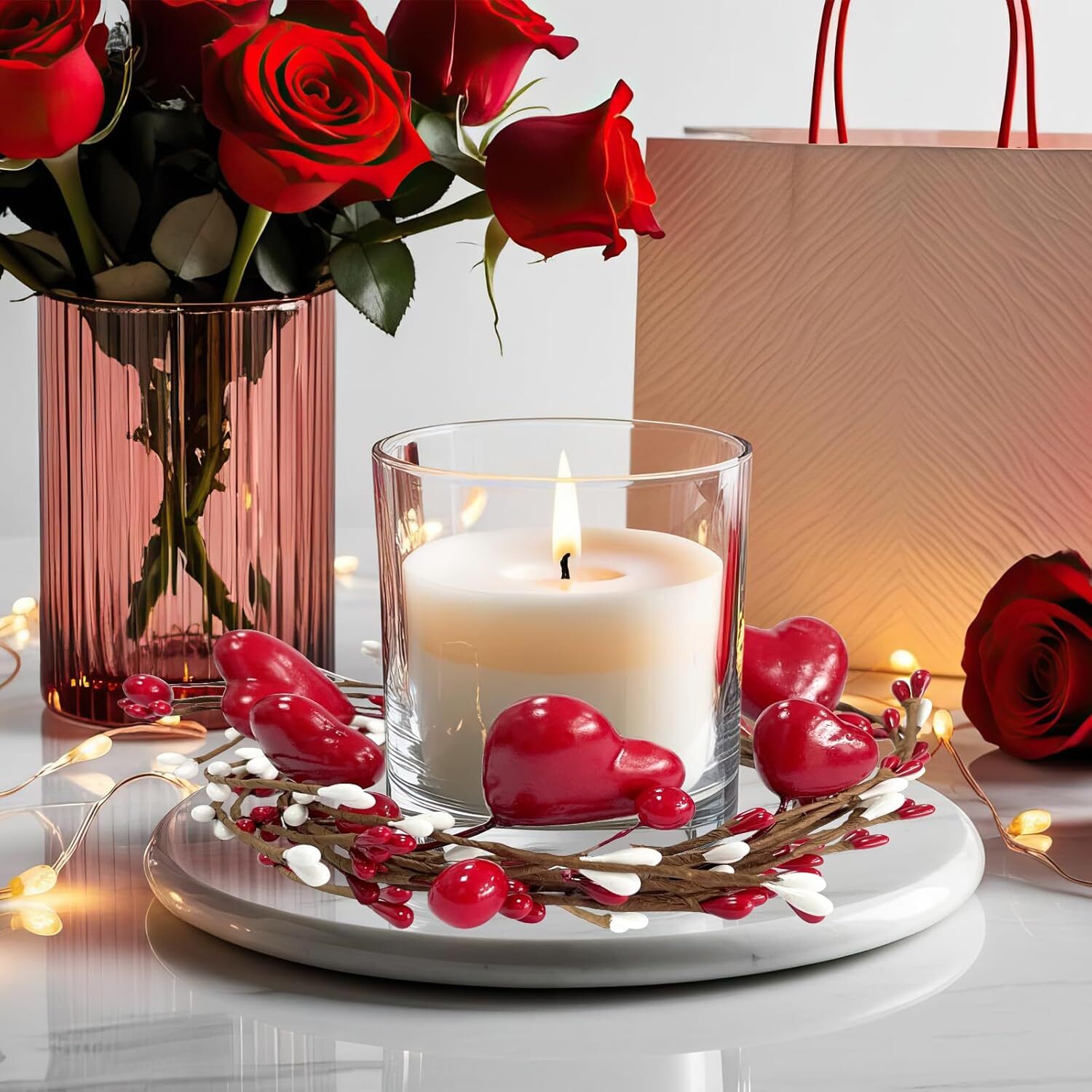9.5" Woven Thread Heart-Shaped Candle Ring Wreath Core Parameters Material: Foam hearts/berries, woven thread branches, floral tape Size: Inner diameter 3.9" (9.9cm), Overall diameter 9.5" (24.1cm) Color: Bright red hearts with burgundy berries Technical Specifications • Includes 2 adjustable wreaths with bendable wire branches • Heart-shaped design with faux red berries for romantic decor • Suitable for pillar candles (3.9" inner diameter) or hanging • Flexible branches allow custom shaping and fluffing • Multi-purpose: Valentine's Day, weddings, home decoration Package Information Package Dimensions: Not specified Contents: 2 candle ring wreaths