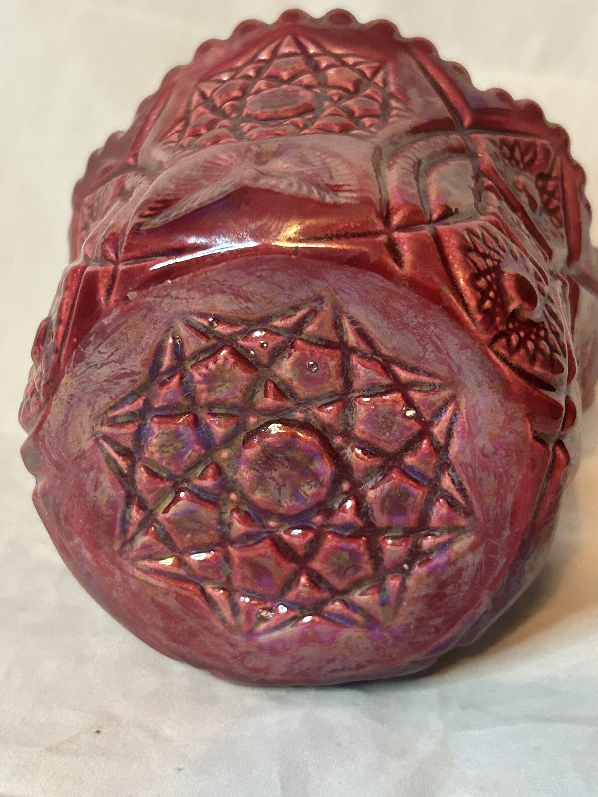 This vintage red mini vase candy dish bowl is a rare find. The intricate diamond pattern on the sawtooth rim adds a touch of elegance to any table setting. Made of high-quality glass, this bowl is perfect for serving candy, nuts, or other small treats. The vibrant red color will add a pop of color to any room. This bowl is sure to impress your guests and is a must-have for any collector.
