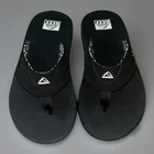 The product is a stylish pair of Reef sandals in black, designed for men with a US shoe size of 9. The slip-on sandals feature a unique bottle opener design, making them perfect for summer days by the beach or pool. The standard shoe width ensures a comfortable fit for all-day wear, while the flip-flop style adds a casual and trendy touch to any outfit. Perfect for beach trips, barbecues, or casual outings in the sun. LN!