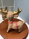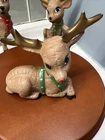 This set of three Reindeer Christmas Figurines are medium-sized ceramic figurines. Hand-painted with polka dots and featuring a brown matte finish, the figurines depicts a festive reindeer characters in different poses. Please see all photos for condition. Older set. I see touch ups on antlers
